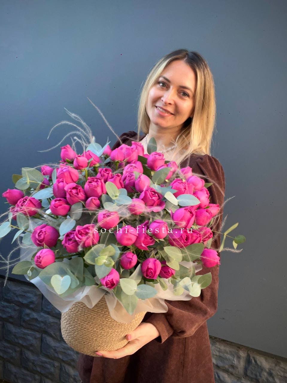Сто один бутон кенийского пионовидного сорта собраны в масштабную композицию. Белая окантовка лепестков переходит в розовый центр. Впечатляющее присутствие в любом пространстве.