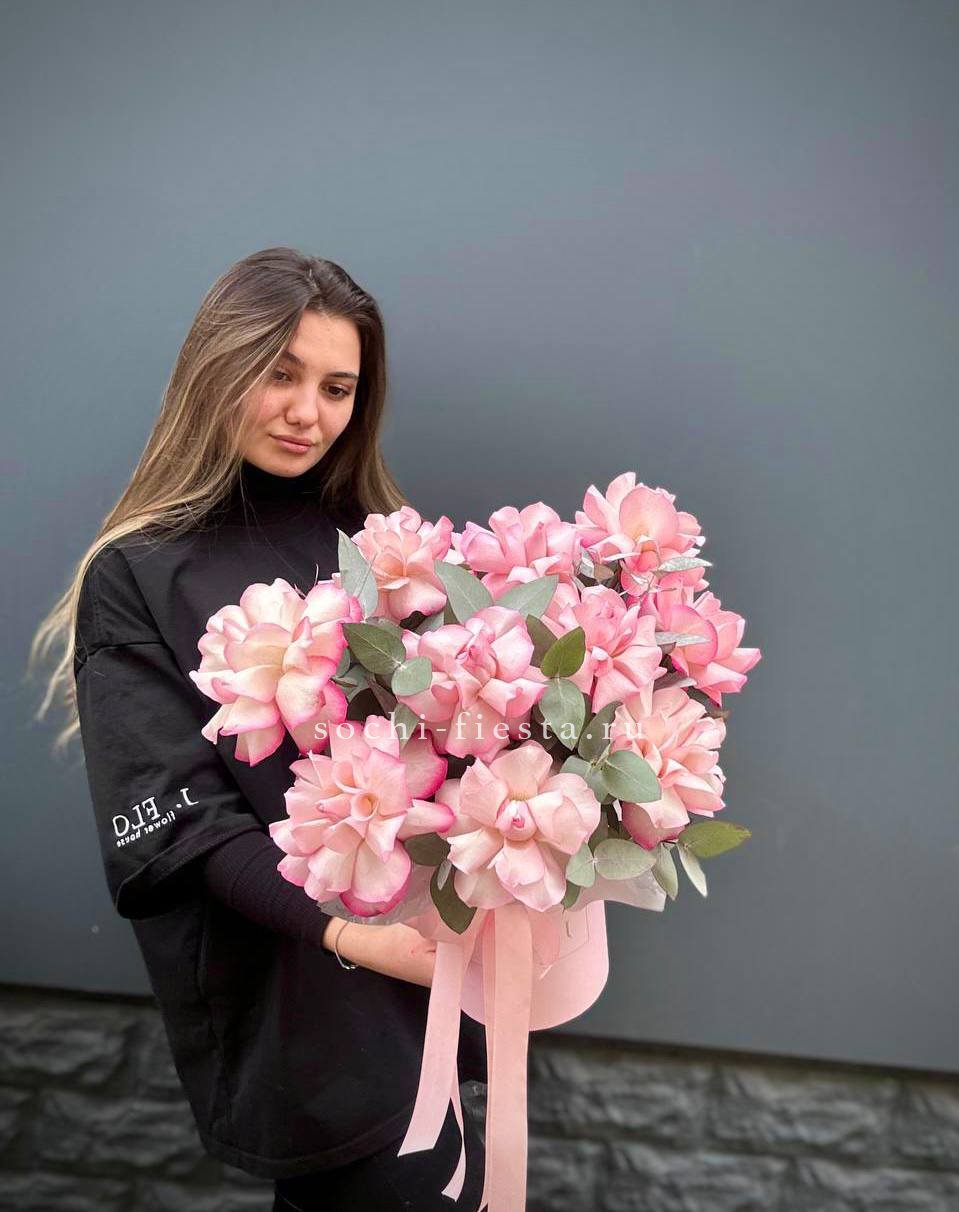 нежный бокс из французских роз сорта Венди, цилиндр D13, эвкалипт, лента, упаковка.