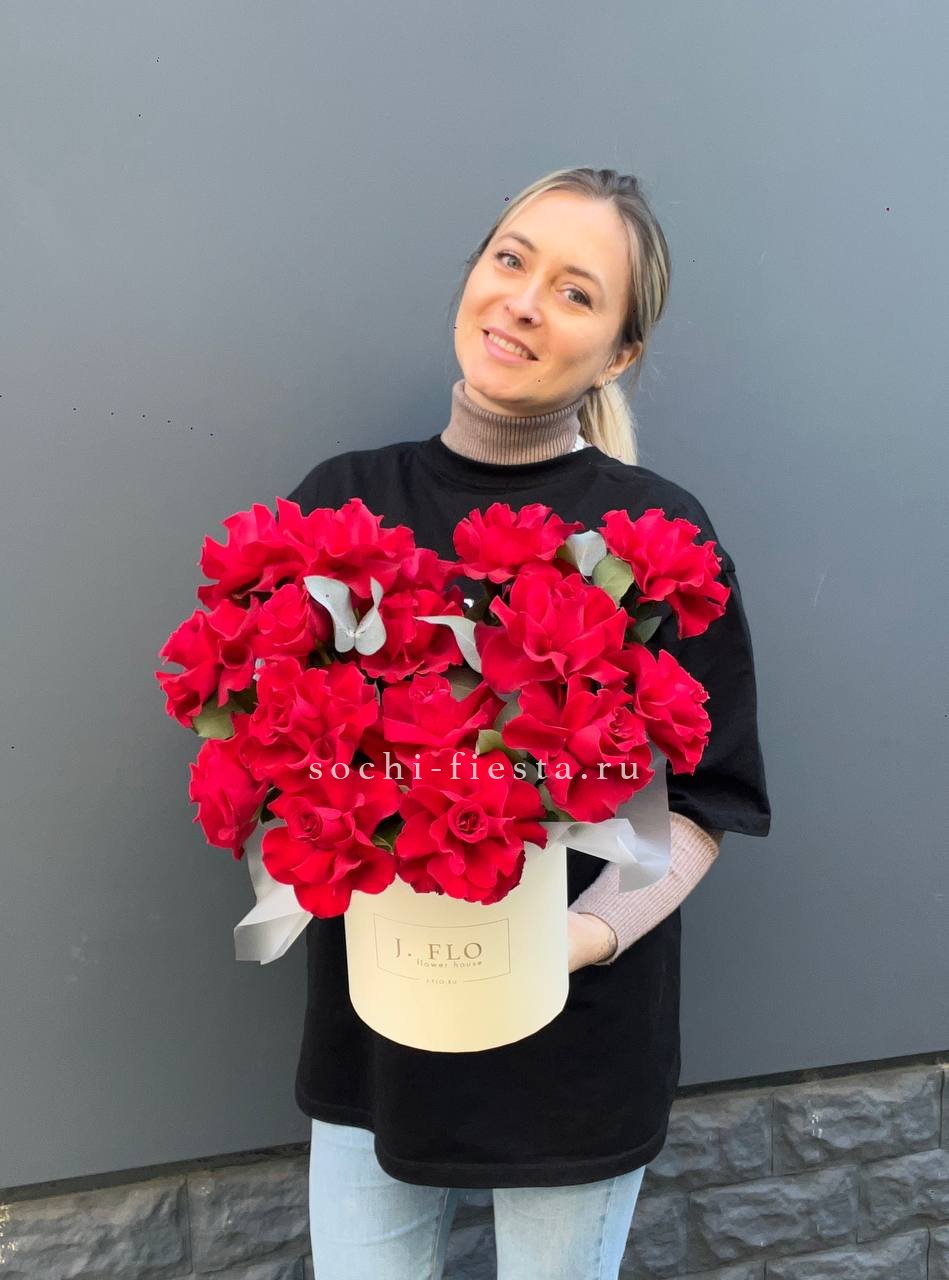 вывернутые красные розы, цилиндр D16, эвкалипт, лента, упаковка.