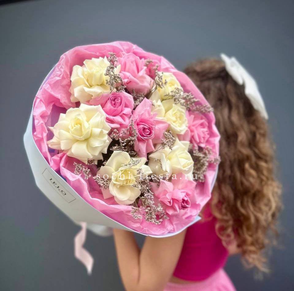 пионовидная кустовая кустовая роза Мисти Баблс, статица, лента, дизайнерская упаковка.