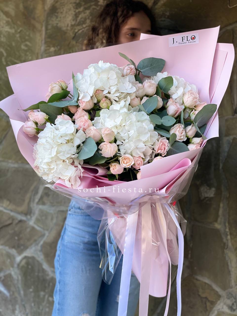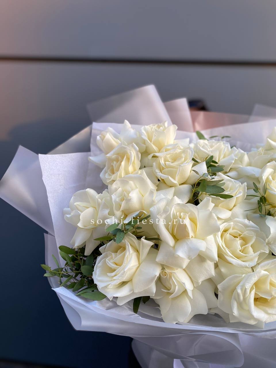 розовые розы, эвкалипт, пленка, корзина.