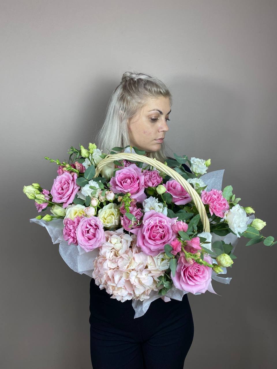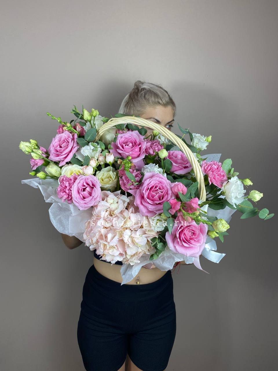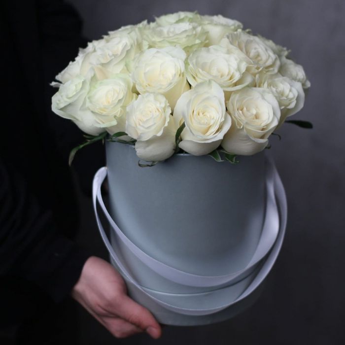 вывернутые розы, цилиндр D13, эвкалипт, лента, упаковка.