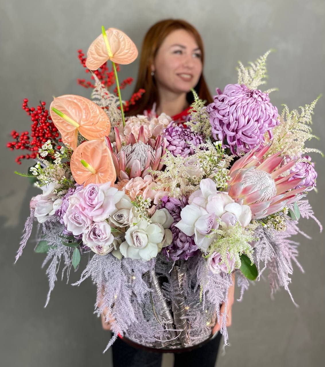 Крупные соцветия гортензии и экзотичные протеи создают плотную текстуру с глубокими переходами оттенков. Антуриумы и пионовидные розы добавляют объёма, а веточки илекса и хамелациума разбивают композицию лёгкими штрихами зелени.