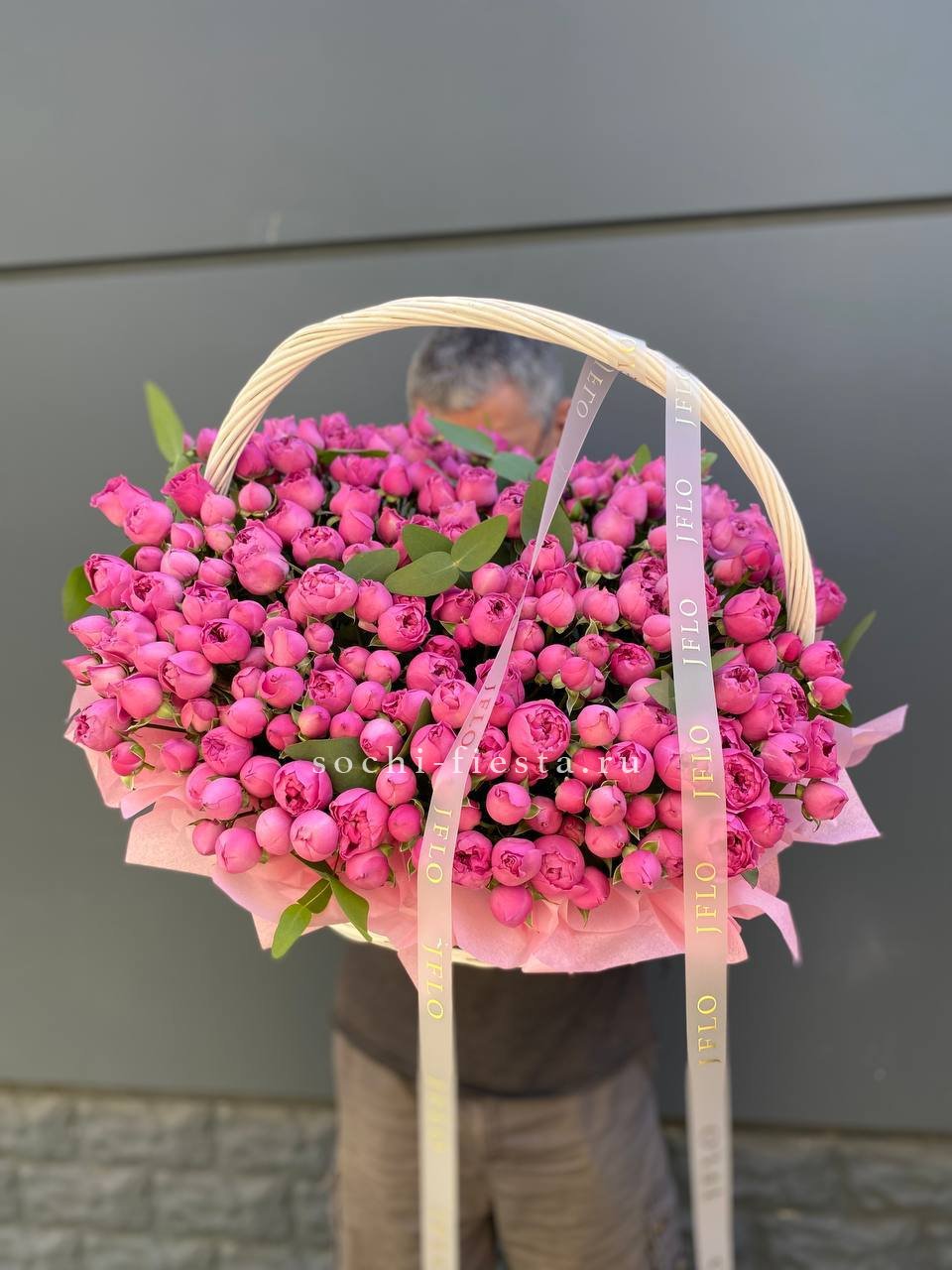 Пятьдесят пять бутонов создают объемную композицию с выразительным силуэтом. Розовый цвет наполняет пространство светом. Авторское оформление завершает образ.