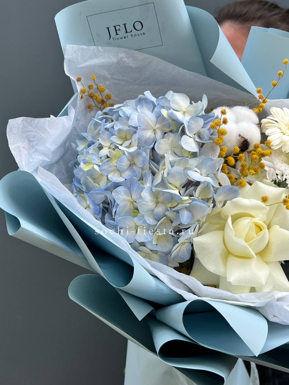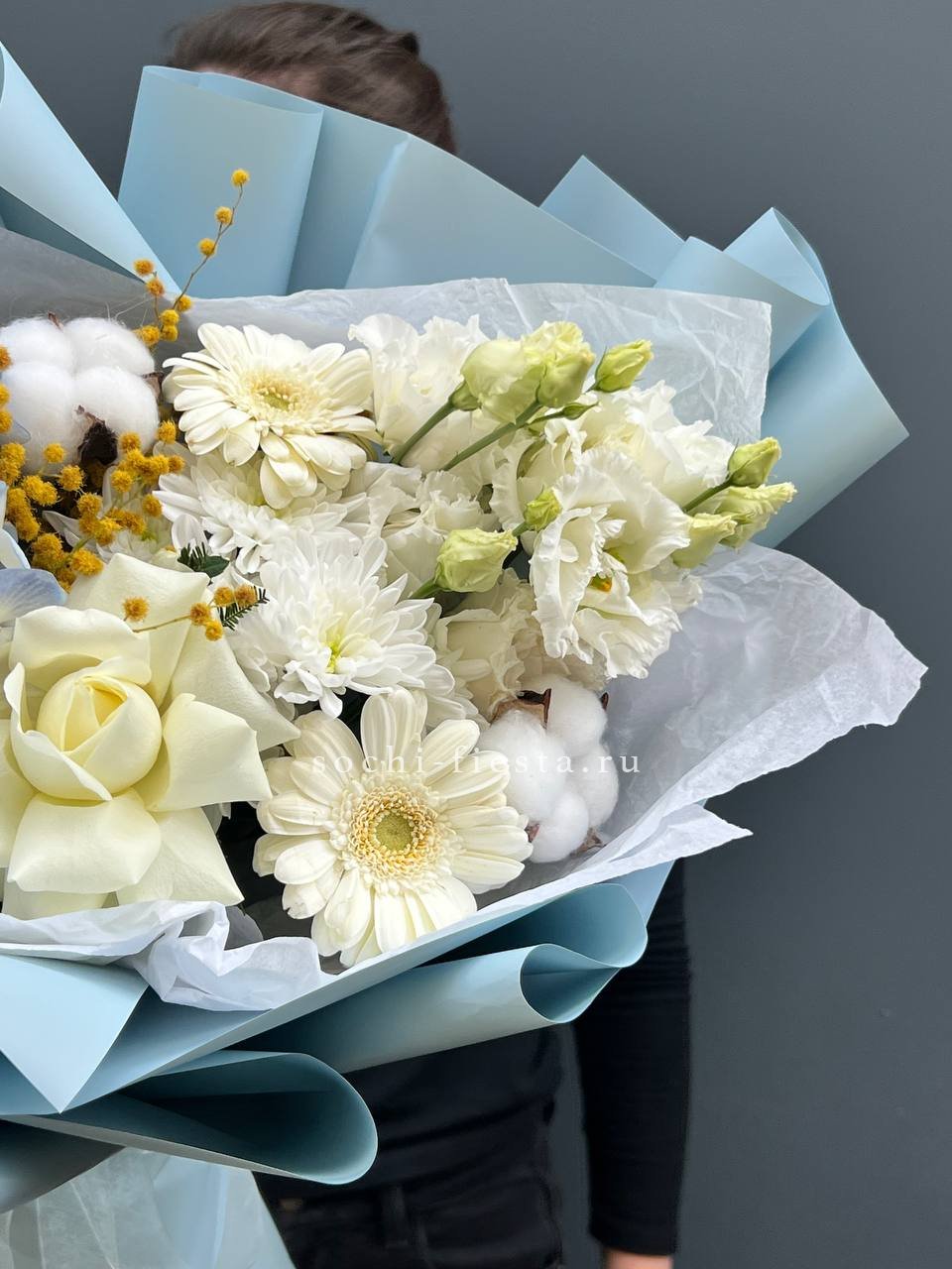гортензия, белые розы, гипсофилы (или мимоза), эустомы, герберы, хлопок, лента и дизайнерская пленка.