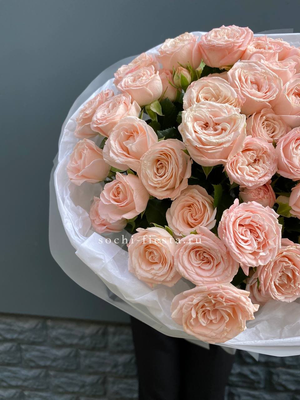Тринадцать стеблей кустовых роз Бомбастик собраны в пышную охапку. Множество бутонов на каждой ветке создают впечатление воздушного облака с мягкими переходами оттенков.