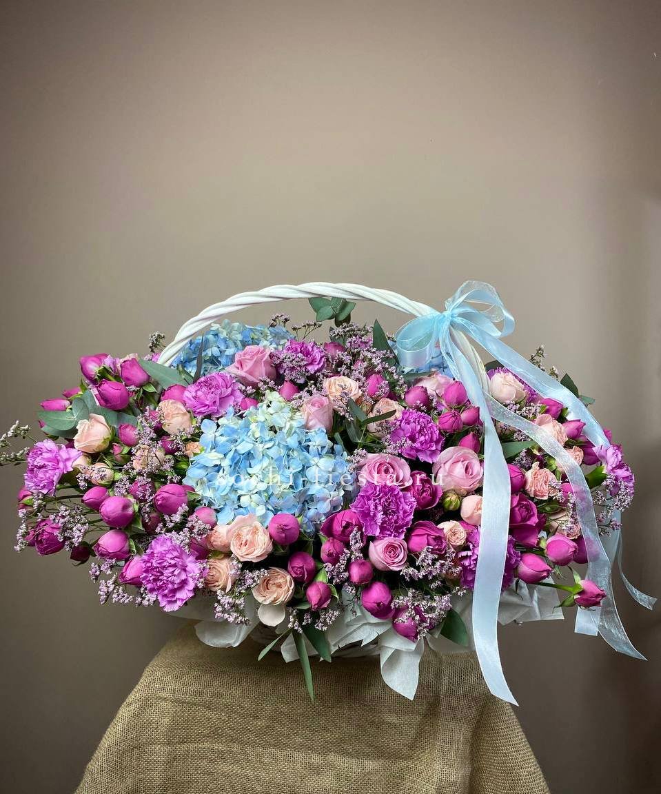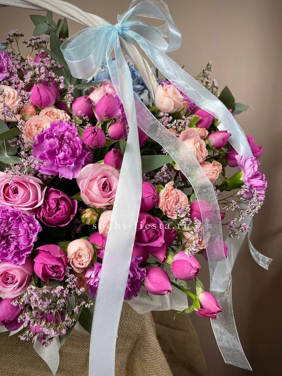 Крупные шапки гортензий формируют основу композиции, розы и эустомы заполняют пространство между ними. Диантусы добавляют графичности. Букет с впечатляющим присутствием и богатой палитрой.