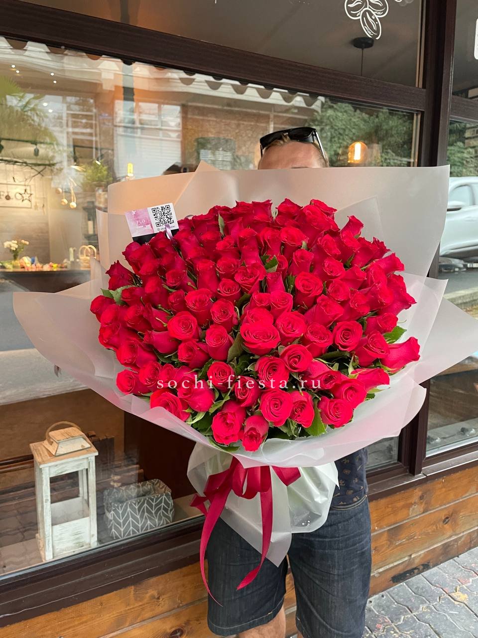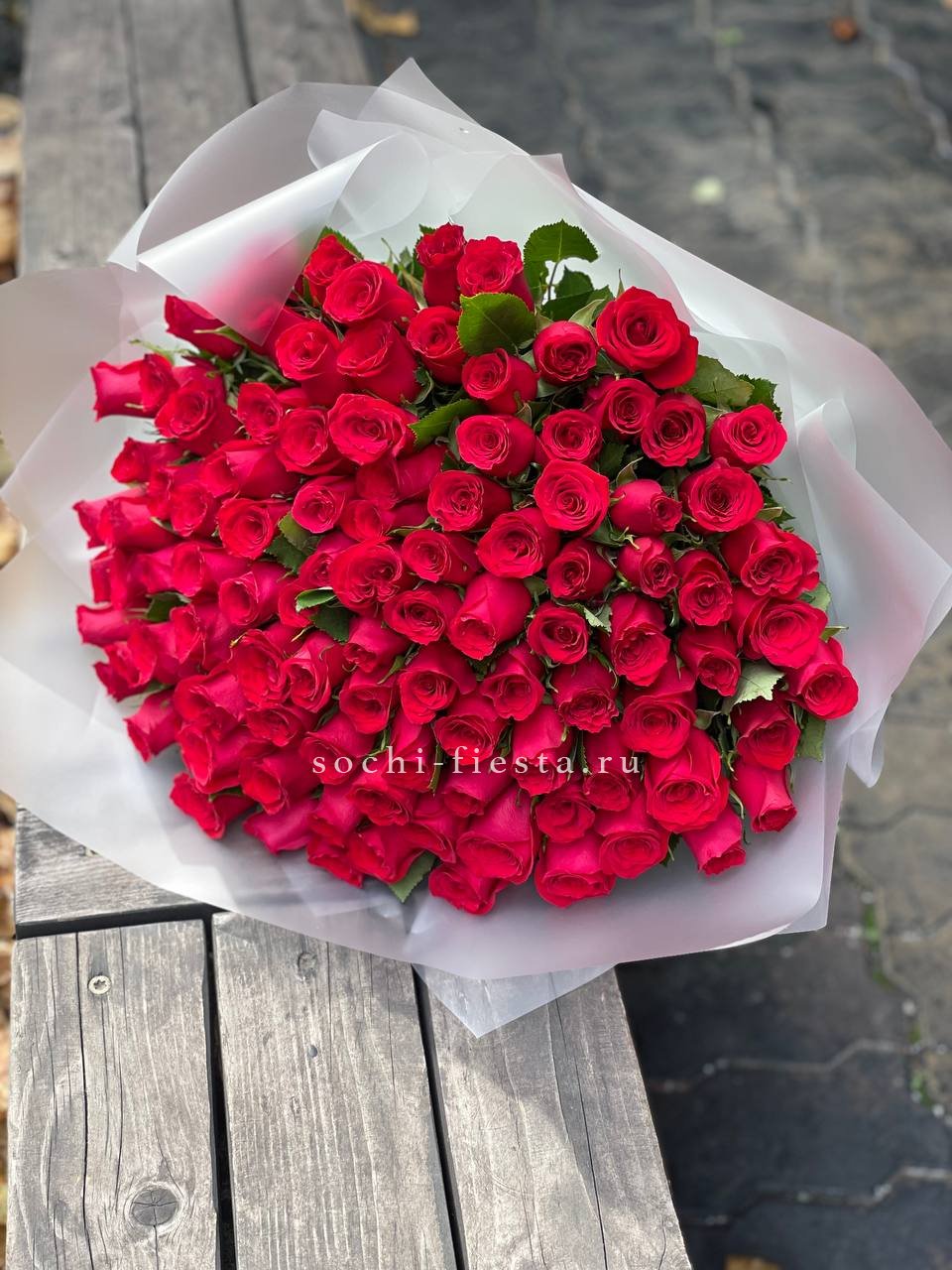 Сорт Lolita отличается насыщенным цветом и крупными бутонами с бархатистой текстурой лепестков. Пятьдесят пять стеблей формируют внушительную композицию с выраженным объемом. Букет выглядит как самостоятельный арт-объект.