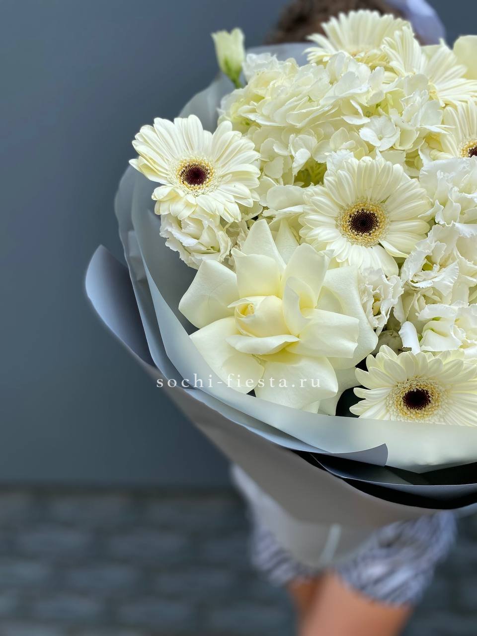 Белые розы, герберы и соцветия гортензии образуют плотную композицию с чёткими линиями. Эустома добавляет воздуха между крупными бутонами, а дизайнерская упаковка завершает форму.