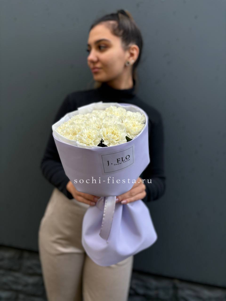 15 белых диантусов,ковыль,лагурус, эвкалипт, лента, дизайнерская пленка.