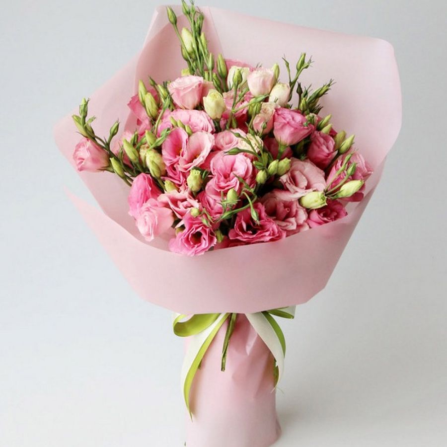 эустома 13-15 веток, лента, дизайнерская пленка или фетр в нежно-розовых тонах.