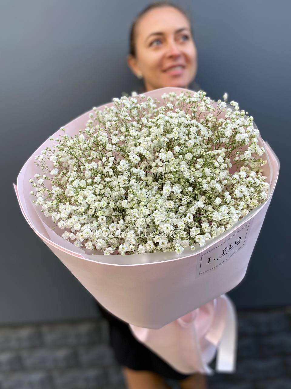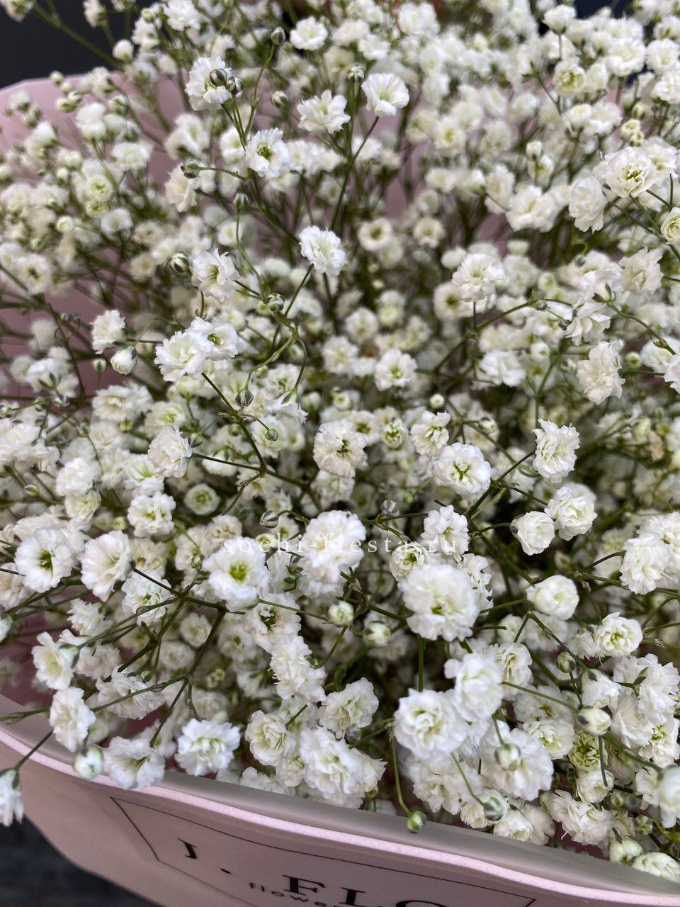 Двадцать пять веточек гипсофилы образуют пышное воздушное соцветие с мягким силуэтом. Белый цвет создает ощущение легкости и свежести в любом интерьере.