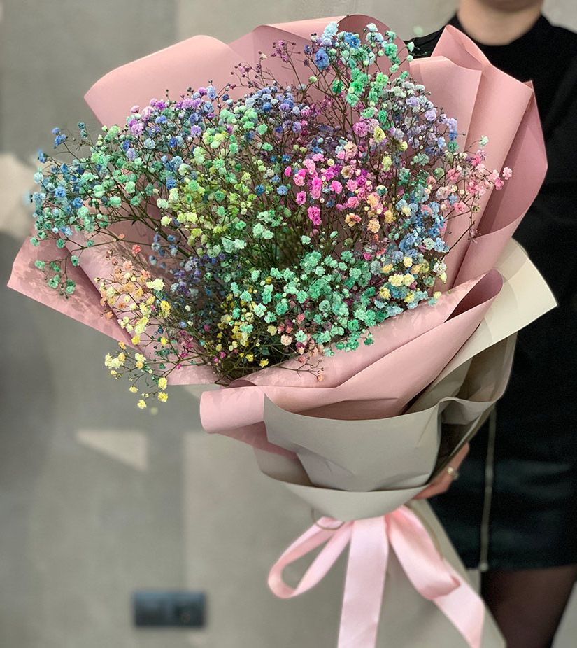 Пять веток гипсофилы раскрашены в спектр от розового до голубого. Пышная воздушная масса мелких цветков формирует лёгкий и жизнерадостный образ.