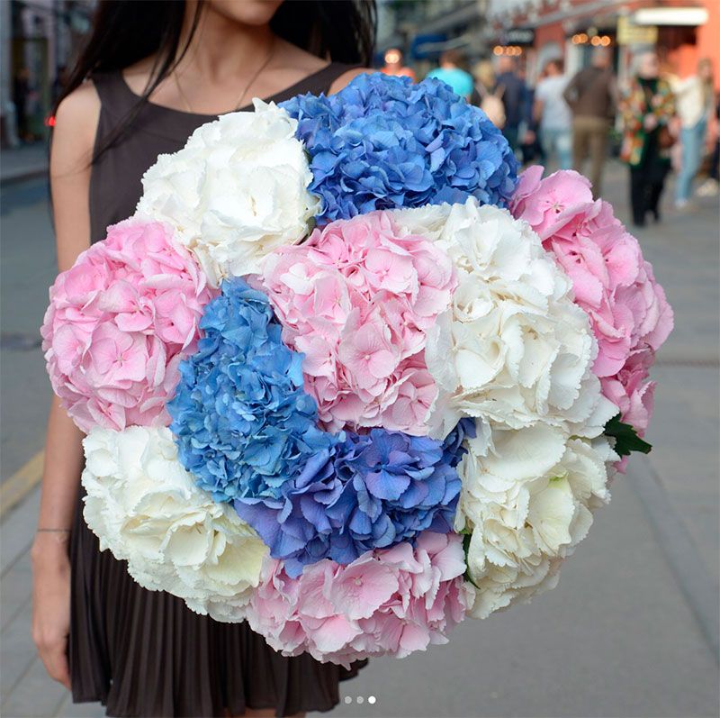 Двадцать одна гортензия разных оттенков собрана в пышную охапку с мягкими переходами цвета. Шаровидные соцветия создают плотную текстуру, а их природная стойкость позволяет наслаждаться букетом долго.