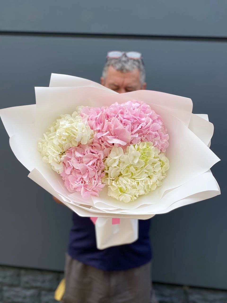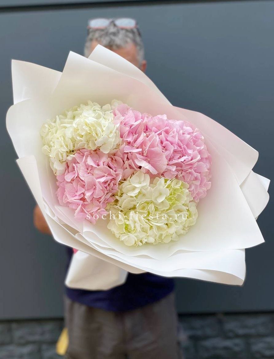 Воздушные шапки соцветий собраны в пышную охапку белоснежного цвета. Гортензия создаёт объёмную текстуру и заполняет пространство мягким природным светом. Букет для тех, кто ценит чистоту линий и естественную красоту.
