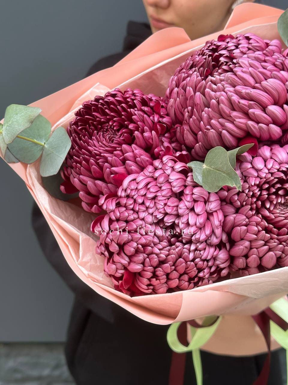 хризантемы Бигуди - 5, эвкалипт,  лента, дизайнерская упаковка.