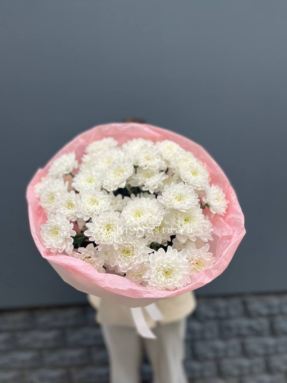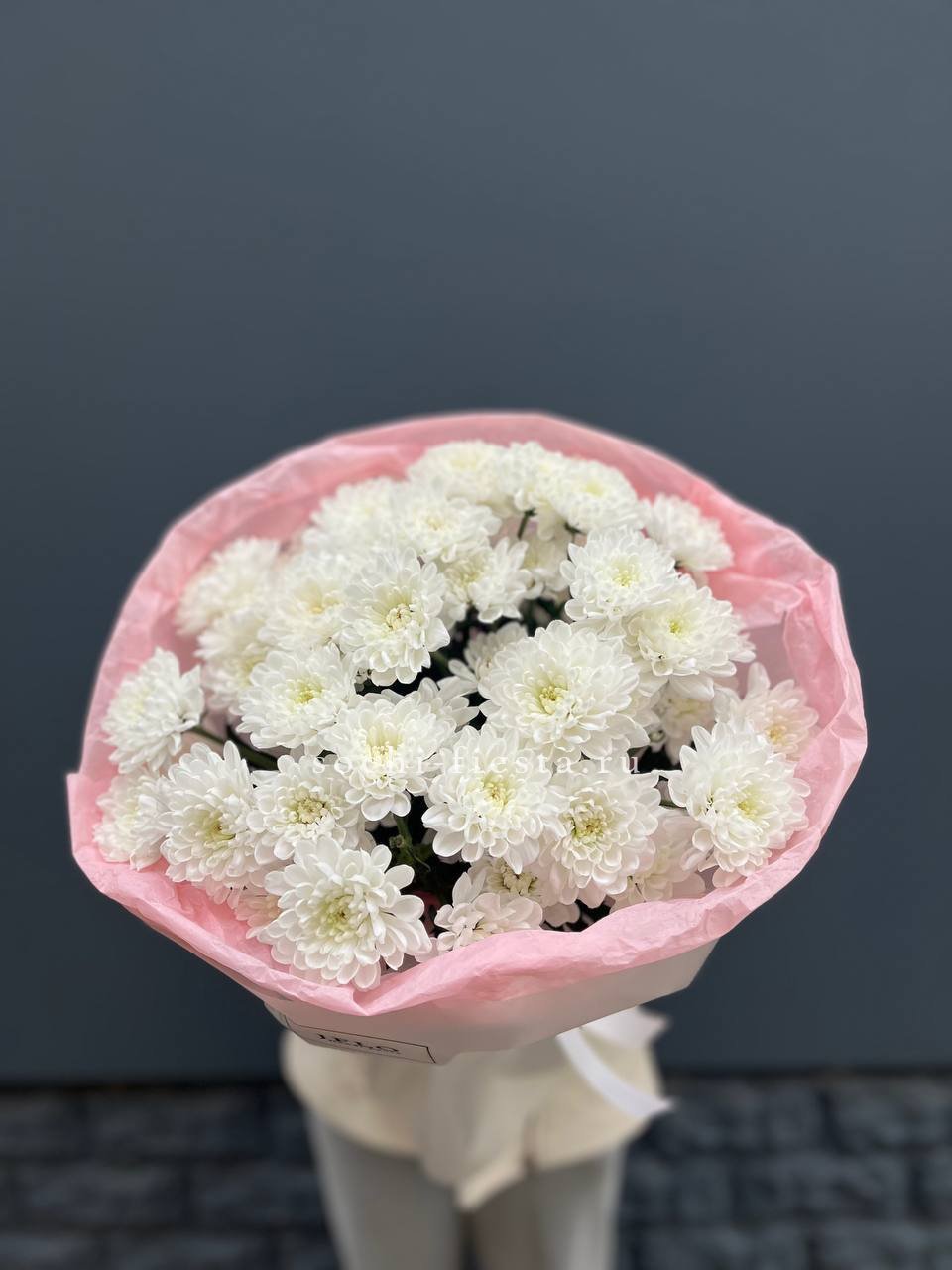 Сто одна хризантема формирует воздушное облако с мягким ритмом бутонов. Объемная композиция держит форму и наполняет пространство легким присутствием.
