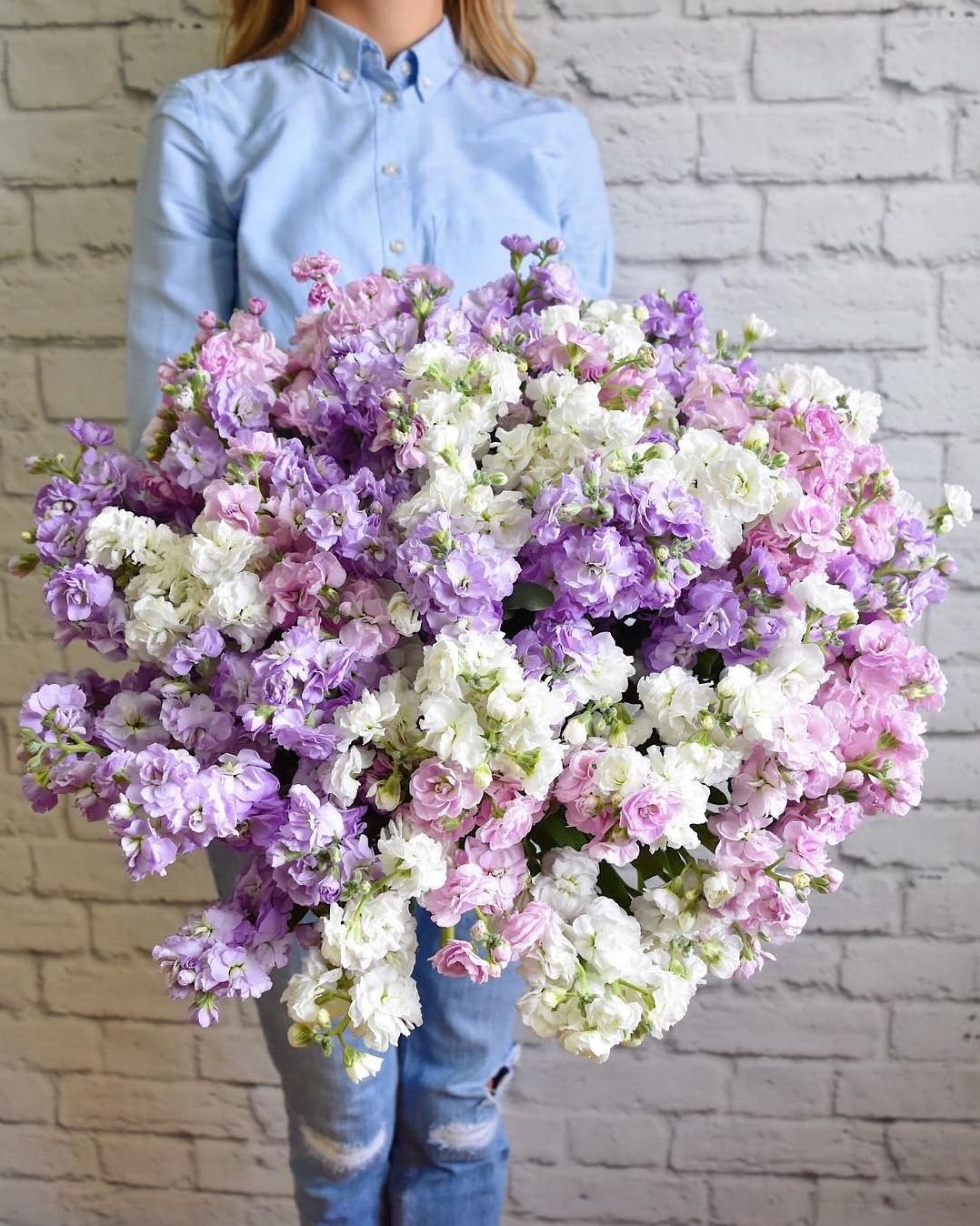 Густая охапка из маттиол образует плотное облако соцветий с многослойной структурой. Каждая веточка добавляет глубину и визуальную насыщенность всей композиции.