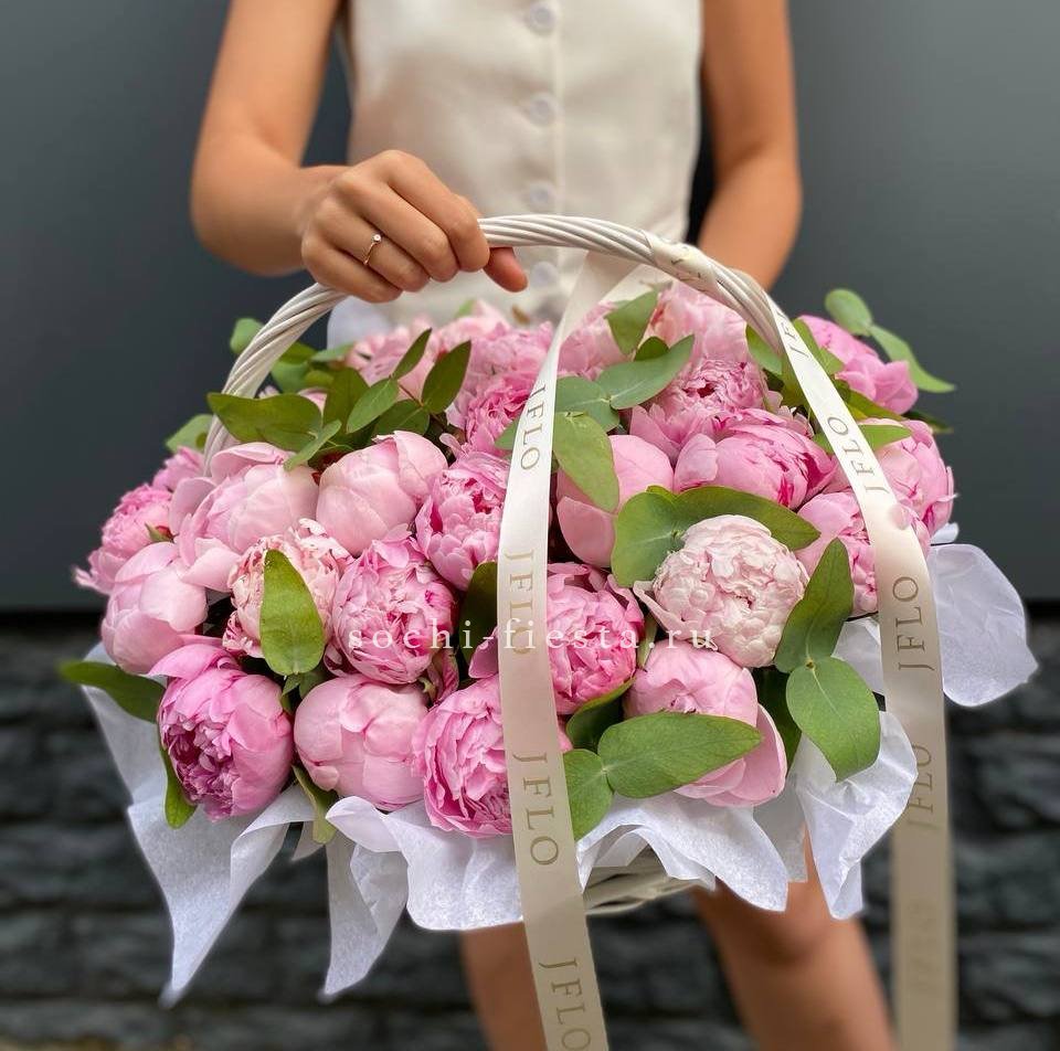 Двадцать девять пионов с ветками эвкалипта собраны в классическую корзину. Бутоны разной степени раскрытия формируют воздушный купол, который сохраняет свежесть и аккуратный силуэт несколько дней.