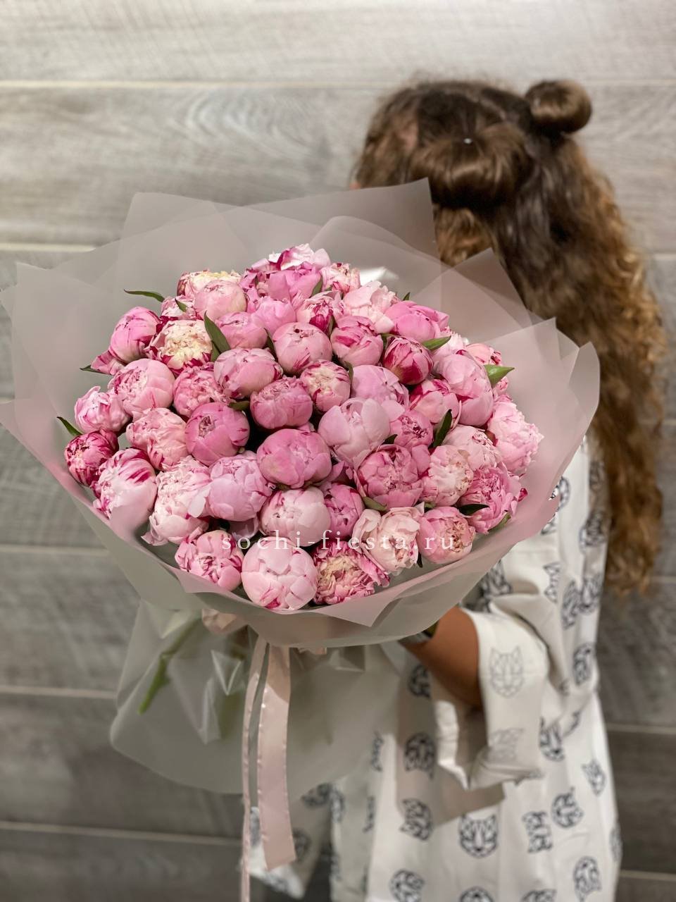51 розовый пион сорта Сара Бернар, лента, дизайнерская упаковка.
