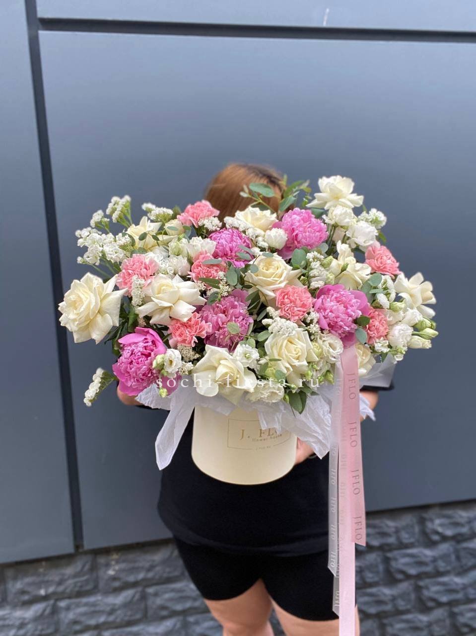 Пионы Buttons с их округлыми махровыми головками собраны в плотную композицию. Дизайнерская упаковка подчёркивает архитектуру букета, а комбинированная текстура материалов добавляет объём и завершённость.
