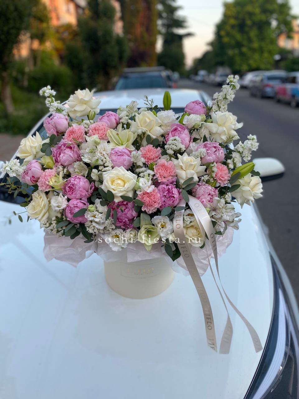 Розовые пионы в паре с озотамнусом держат форму и долго сохраняют свежесть. Компактная сборка удобна для размещения в любом пространстве.