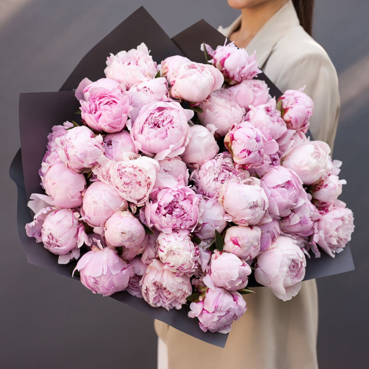 розовый пион сорта Сара бернар, лента, дизайнерская упаковка.