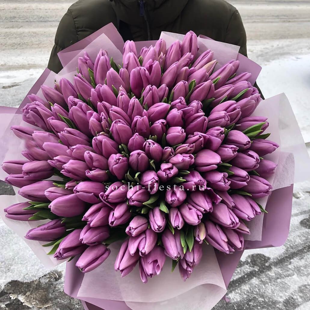 Сто один тюльпан создает плотное облако лавандового оттенка. Весенний букет с мягким силуэтом и свежим характером.