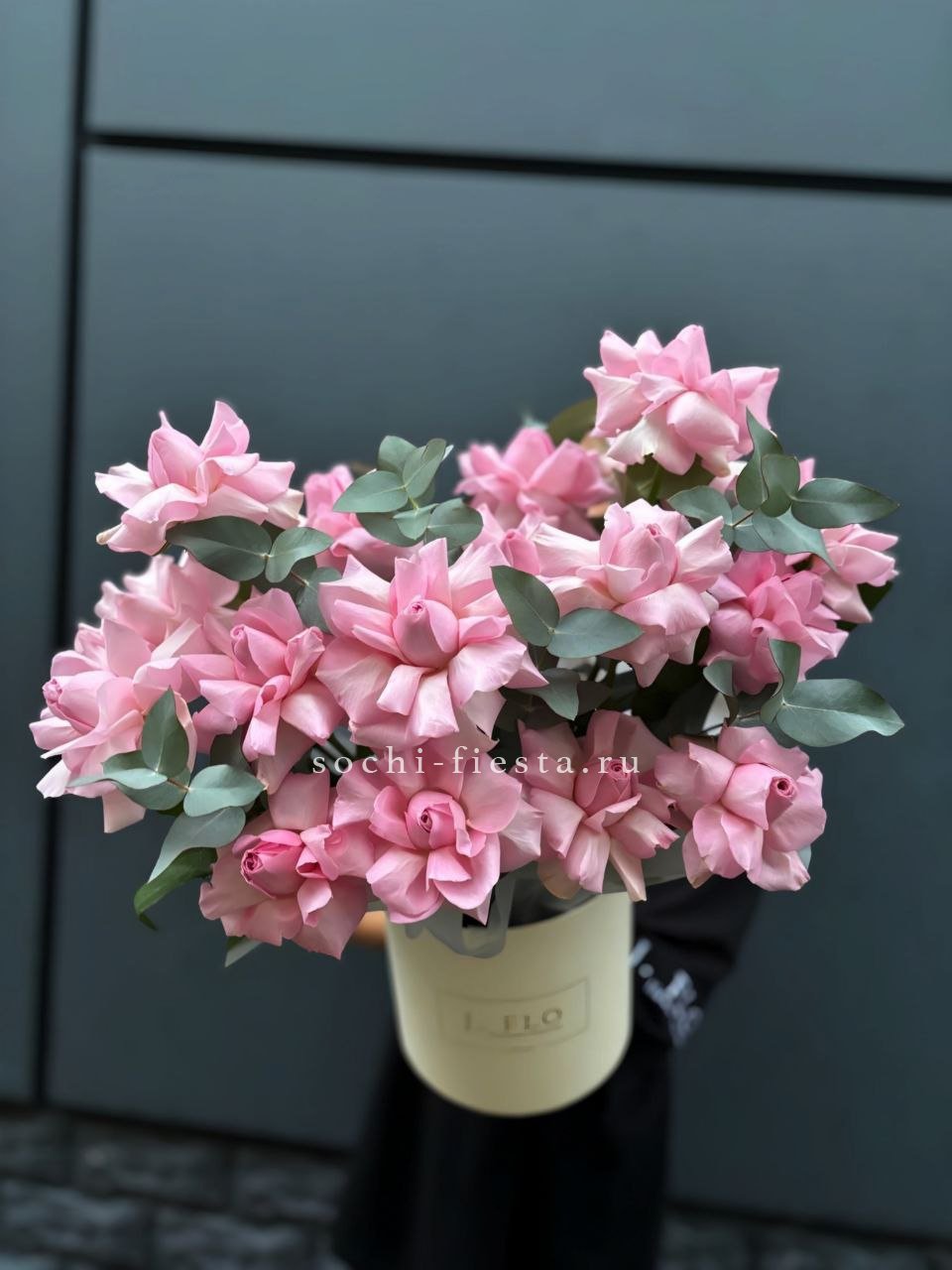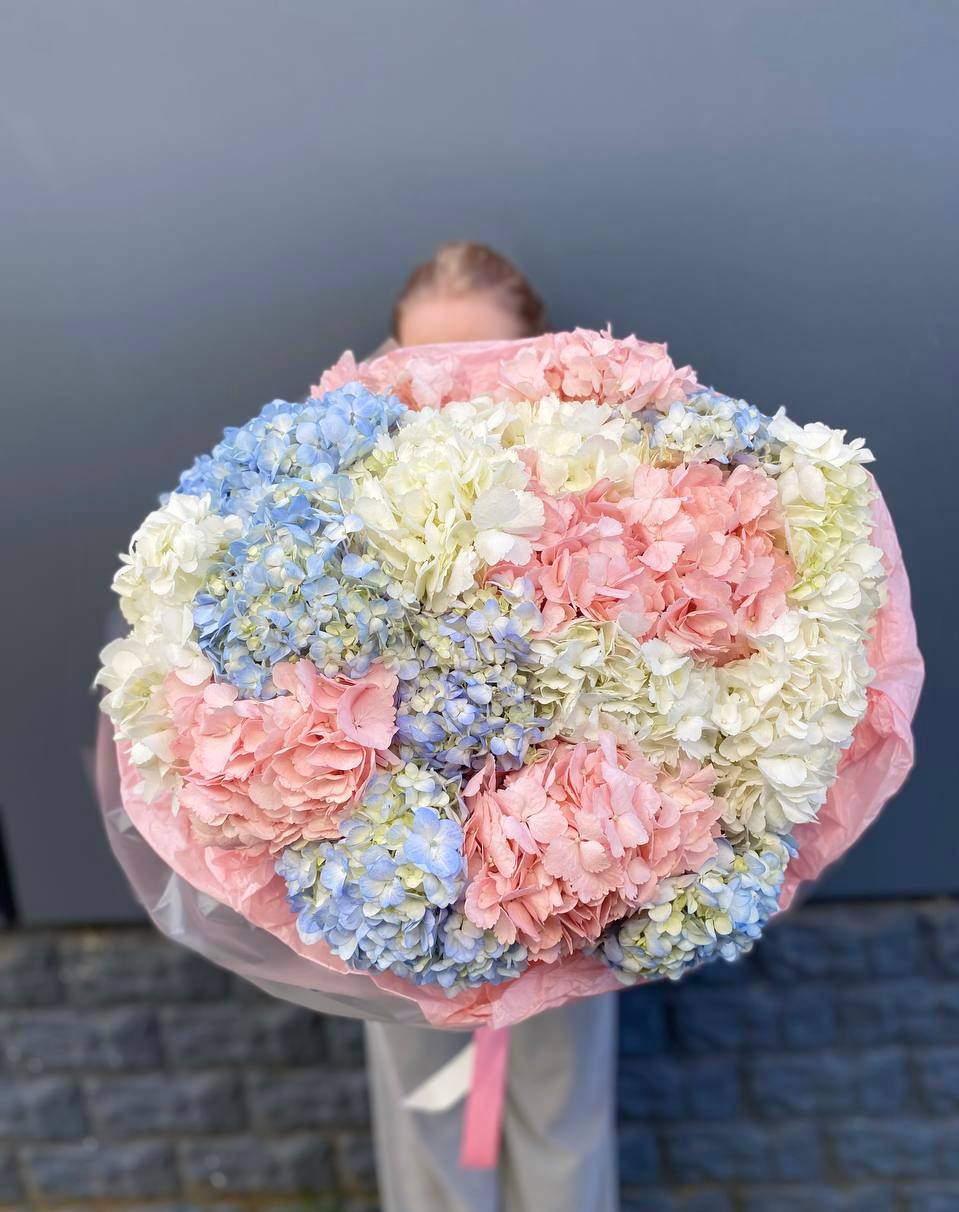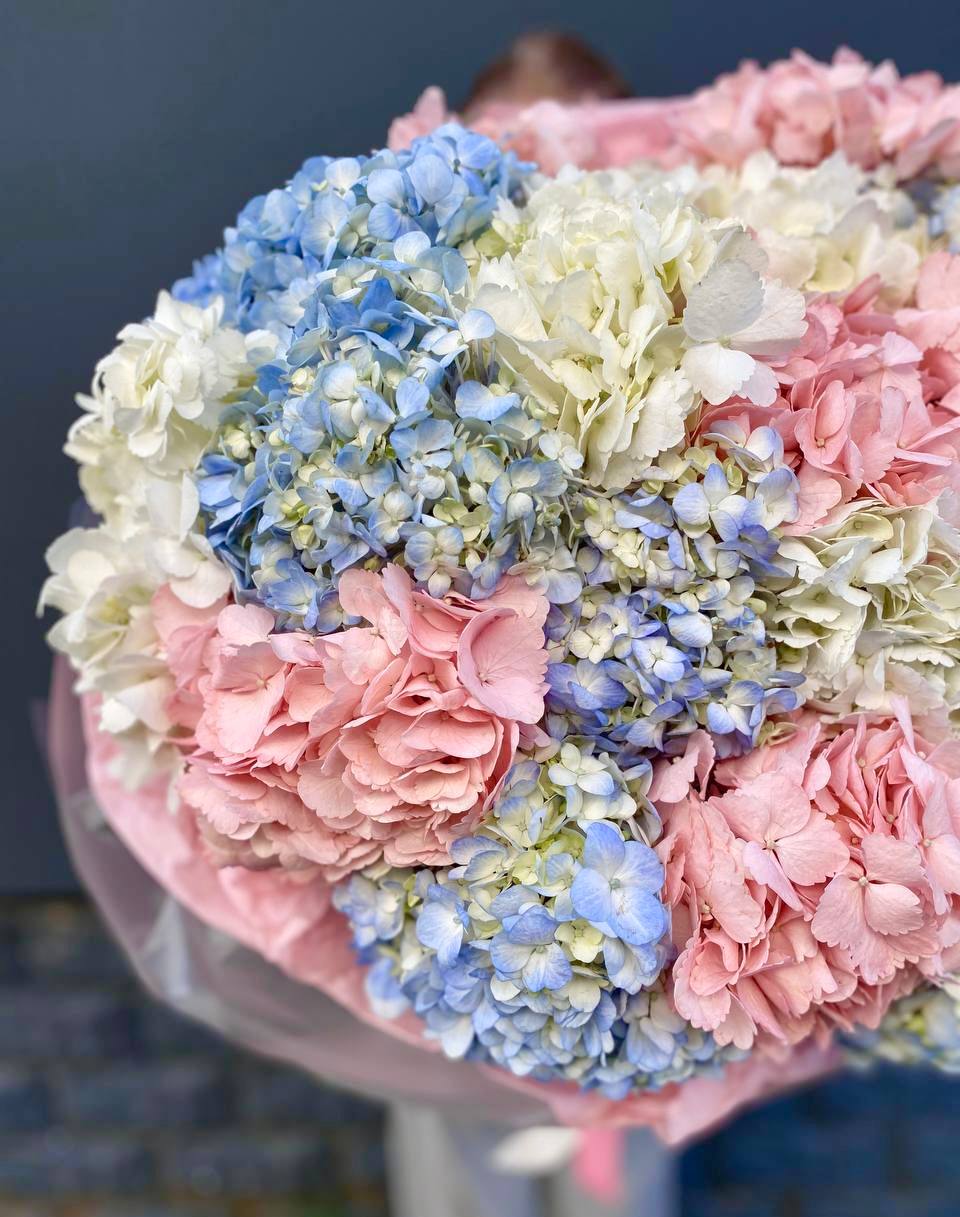 гортензия, эустома, кустовая роза, маттиола (или львиный зев), роза одноголовая, каллы (или аналог), эвкалипт, лента, упаковкаСостав букета в несозон может нести незначительные изменения.