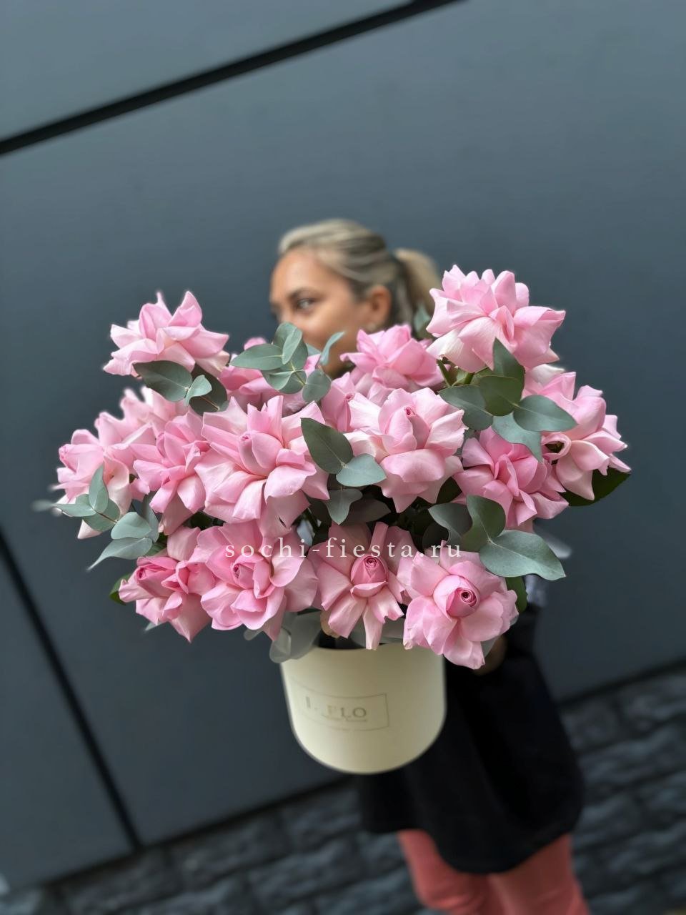 Плотная сборка с открытыми бутонами роз и воздушными соцветиями гортензии создаёт многослойную композицию. Белые каллы и маттиола добавляют вертикальные линии, а эвкалипт смягчает переходы между крупными формами.