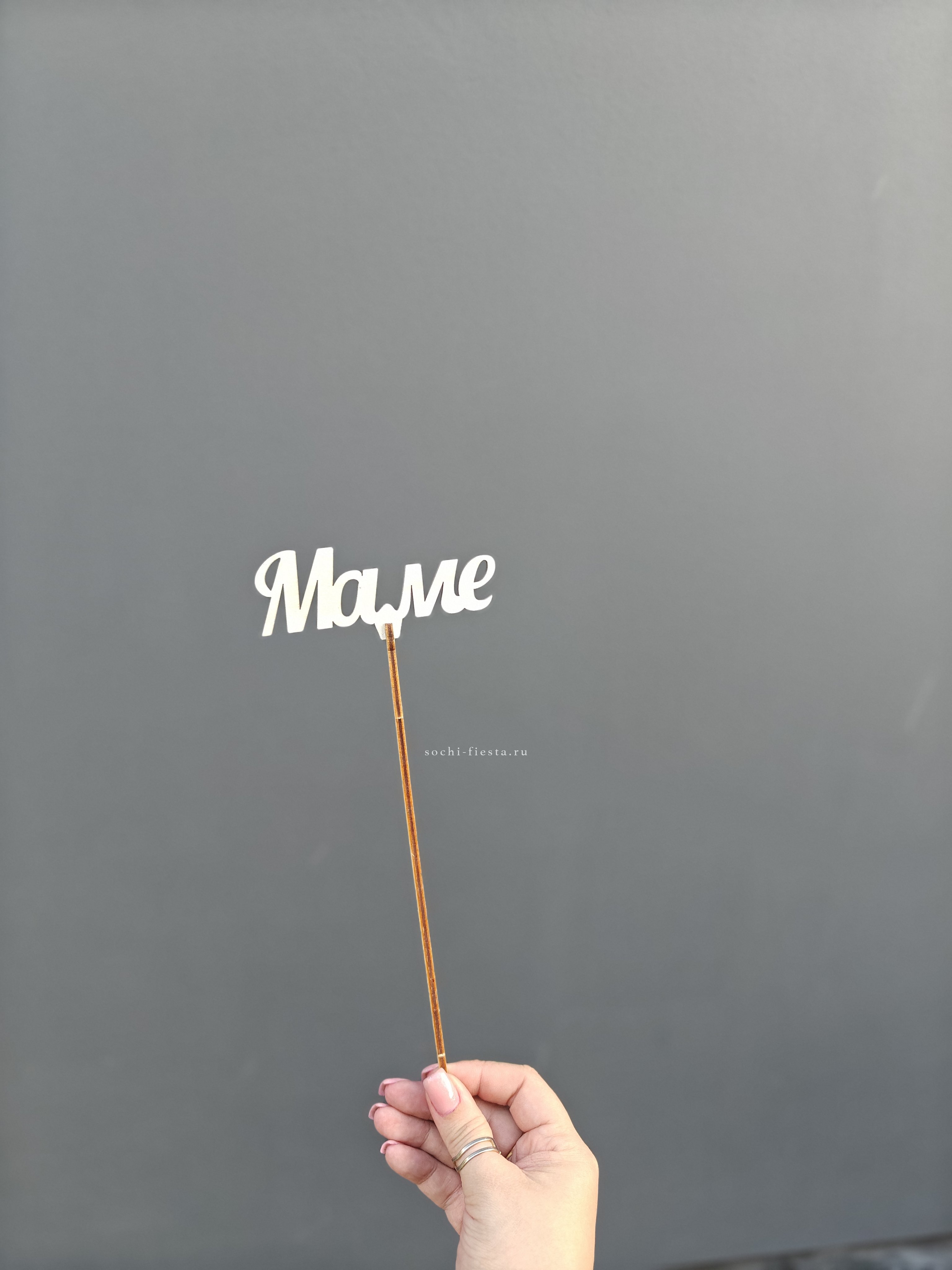 Деревянный топпер с теплой надписью для мамы. Устанавливается прямо в букет и добавляет личное обращение. Завершает композицию и делает послание понятным с первого взгляда.