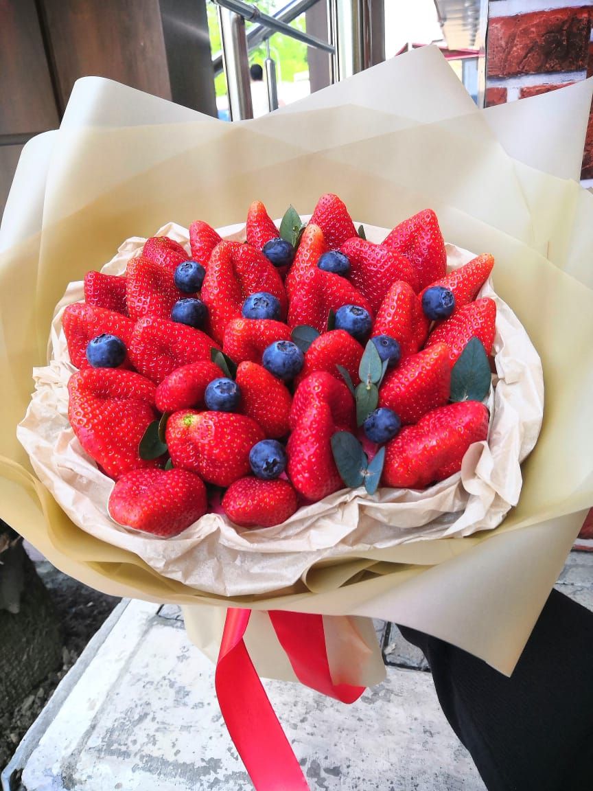 500-550г. ароматной клубники, голубика, лента, крафт.
