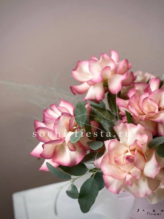 Воздушная композиция в пастельной гамме с акцентом на фактуру раскрытых бутонов. Пионовидные розы и эустома создают объёмный силуэт, а хлопок добавляет графичности.
