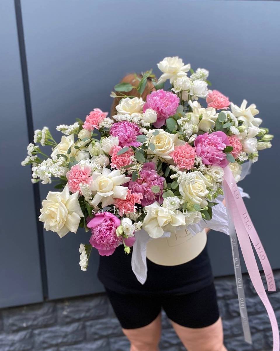Пионы раскрываются пышными головками, окружённые воздушной статицей и многослойной эустомой. Маттиола вносит лёгкую небрежность, а диантусы расставляют яркие точки в общей картине.