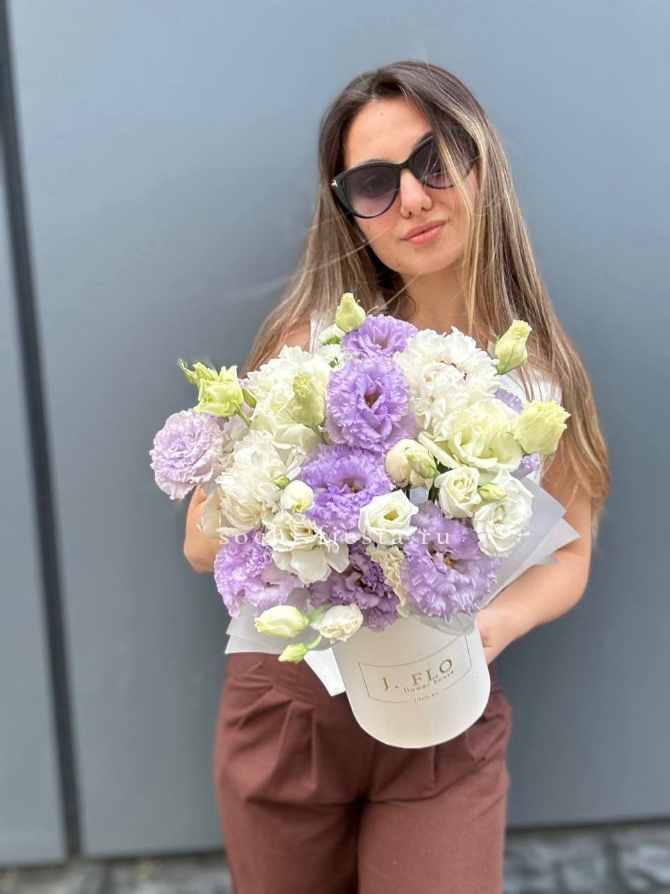 Эустома и пионы в цилиндре дают мягкое цветовое пятно с воздушной текстурой. Эвкалипт обрамляет композицию и добавляет свежую зелёную ноту общему впечатлению.