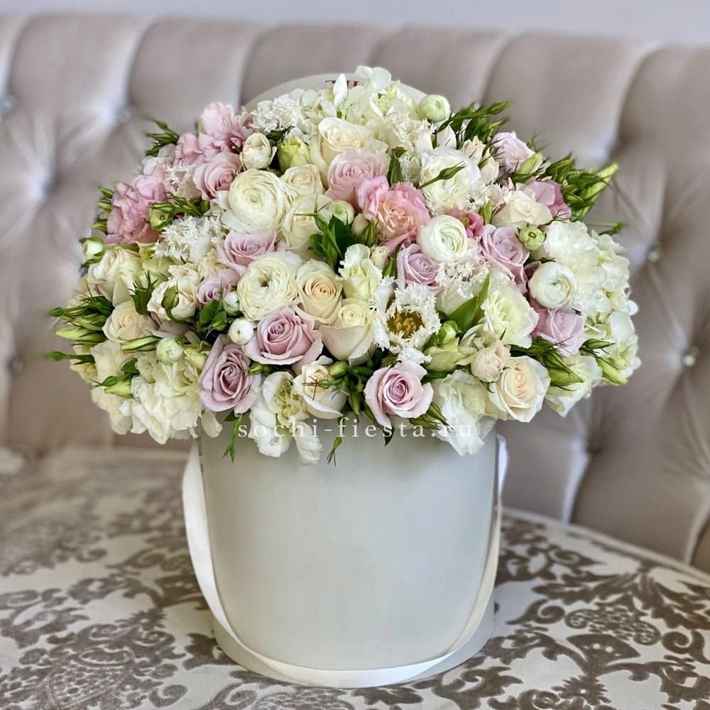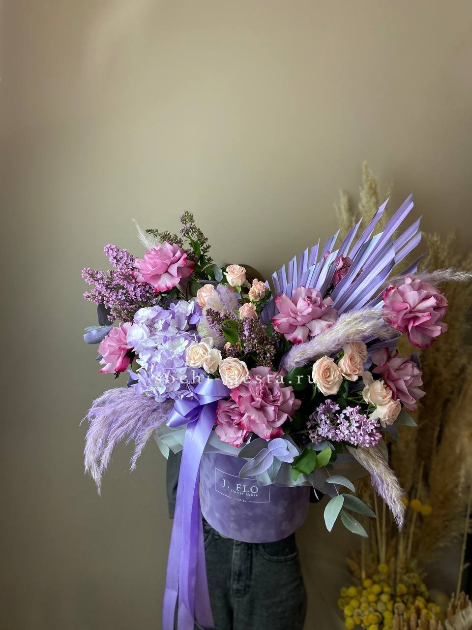 Розовые розы и сирень с гортензией собраны в свободную композицию с эвкалиптом и картадерией. Цилиндр фиксирует форму и дает цветам дышать без лишней плотности.
