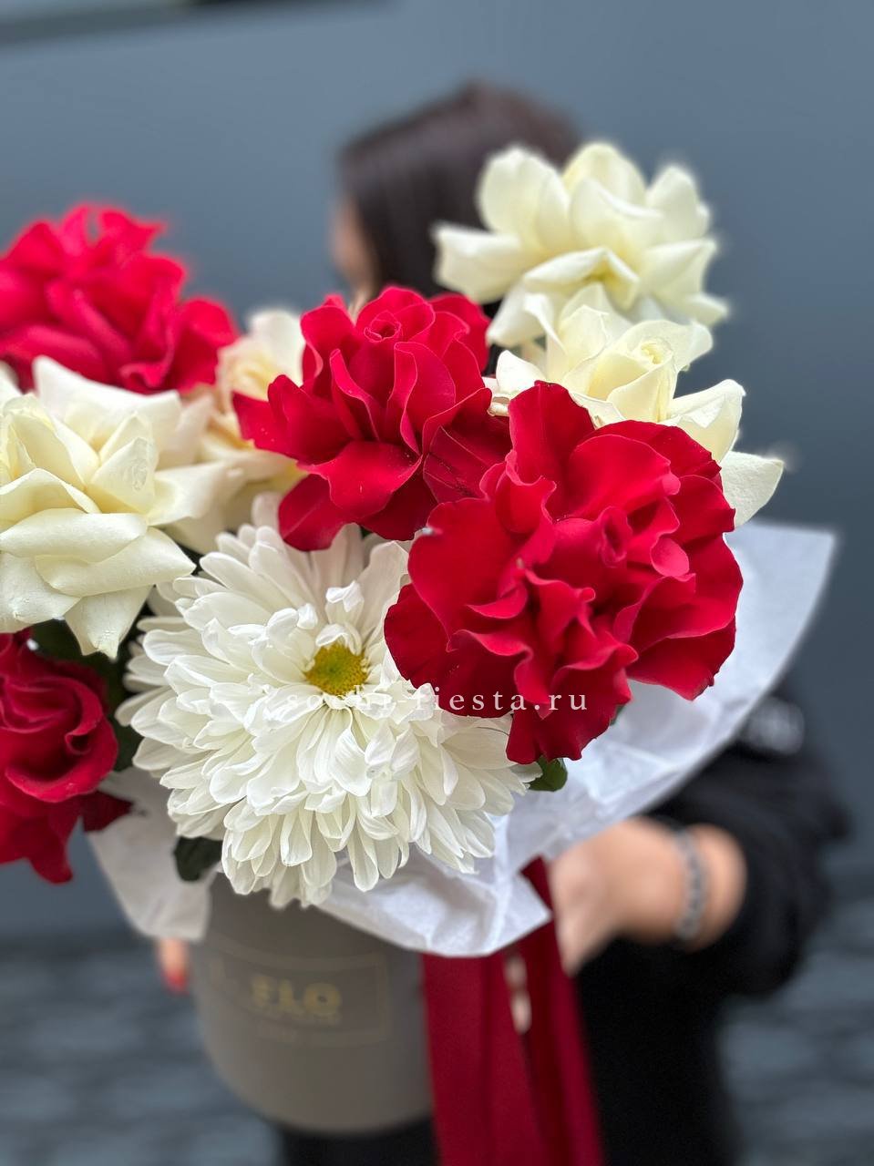 Белый и красный встречаются в одной композиции, где каждый оттенок занимает своё место. Хризантема добавляет плотности и завершает линию цилиндра.