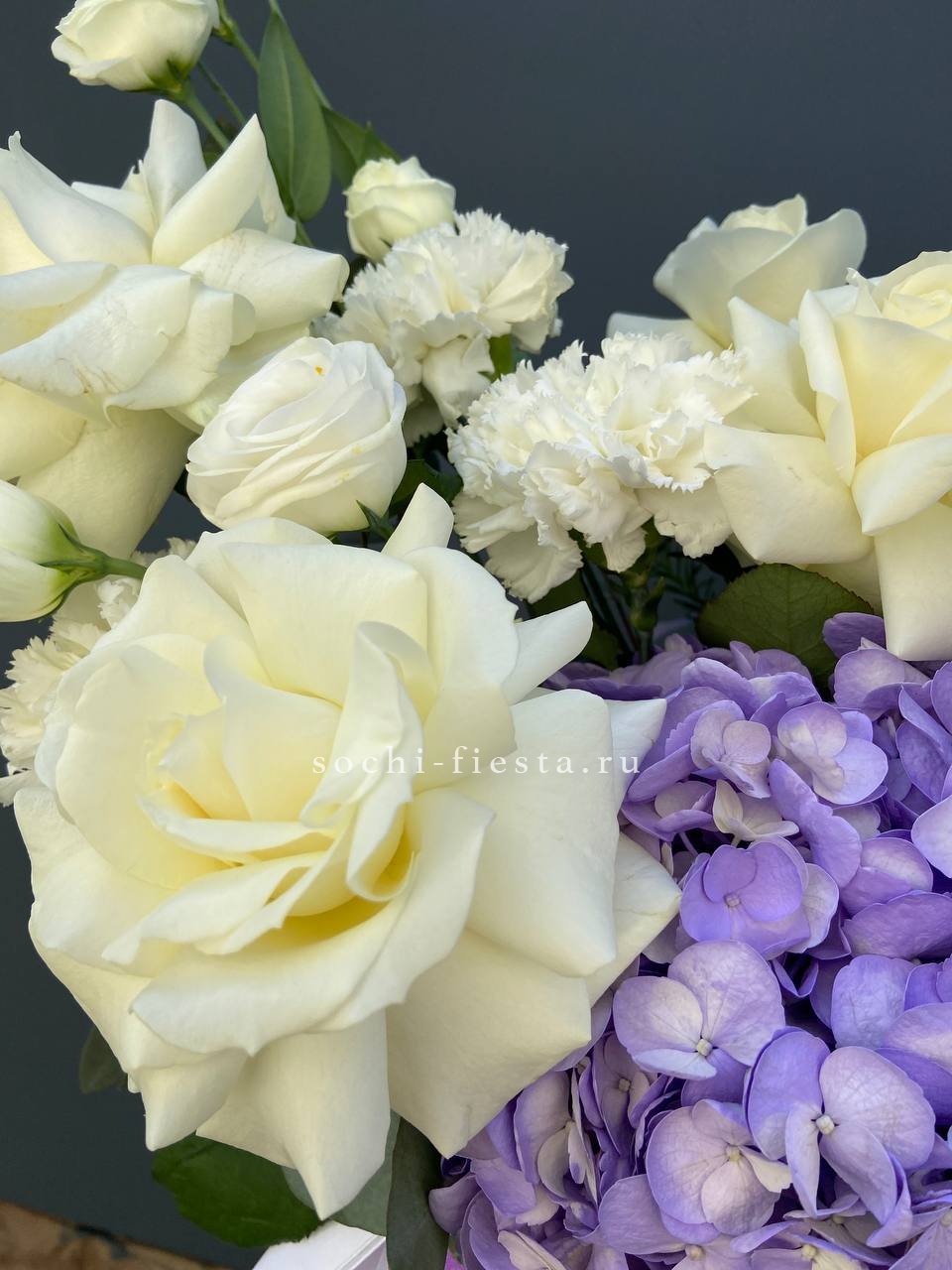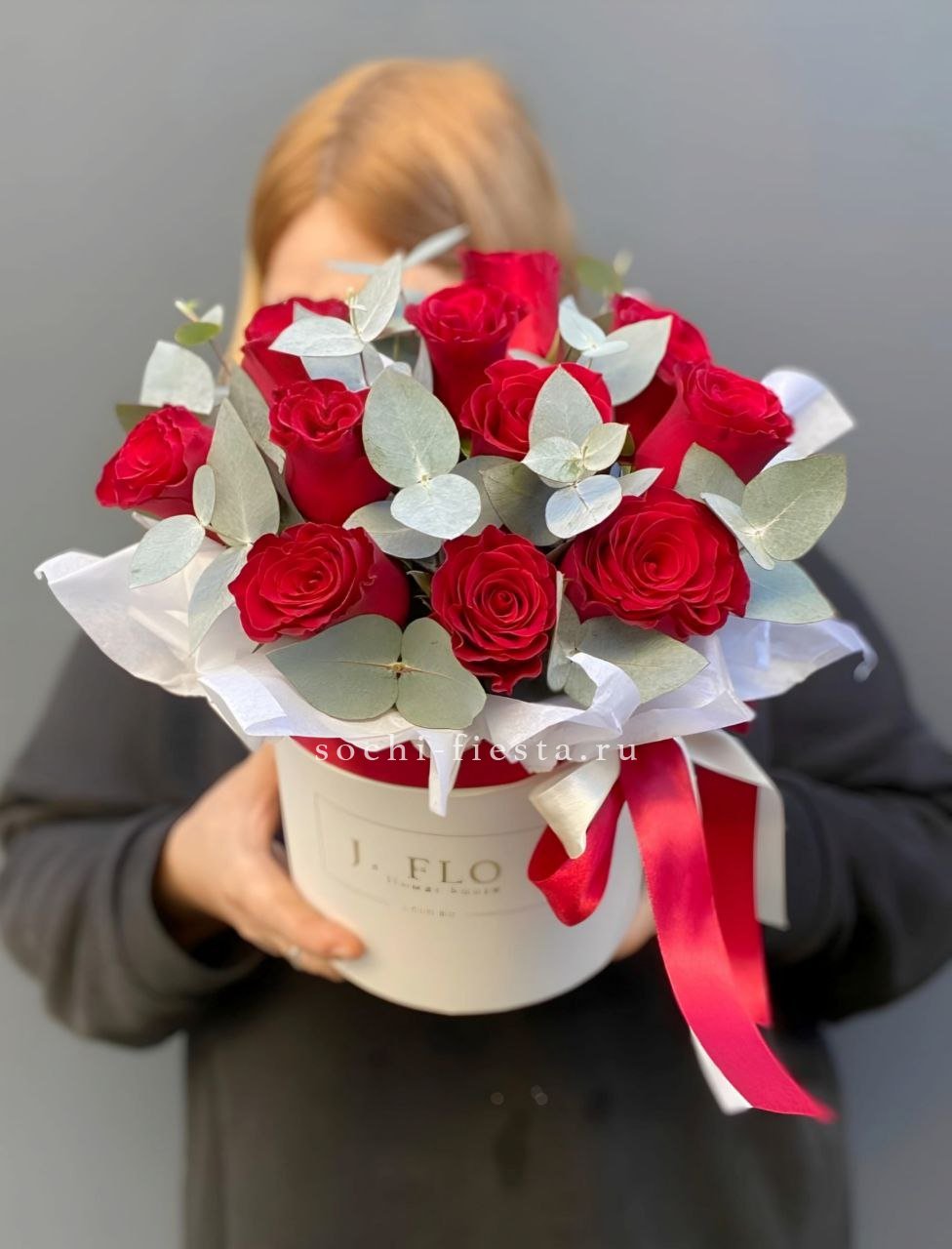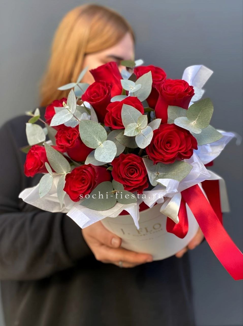 пионовидные кустовые розы, эвкалипт, лимониум, зелень, лента, цилиндр D16.