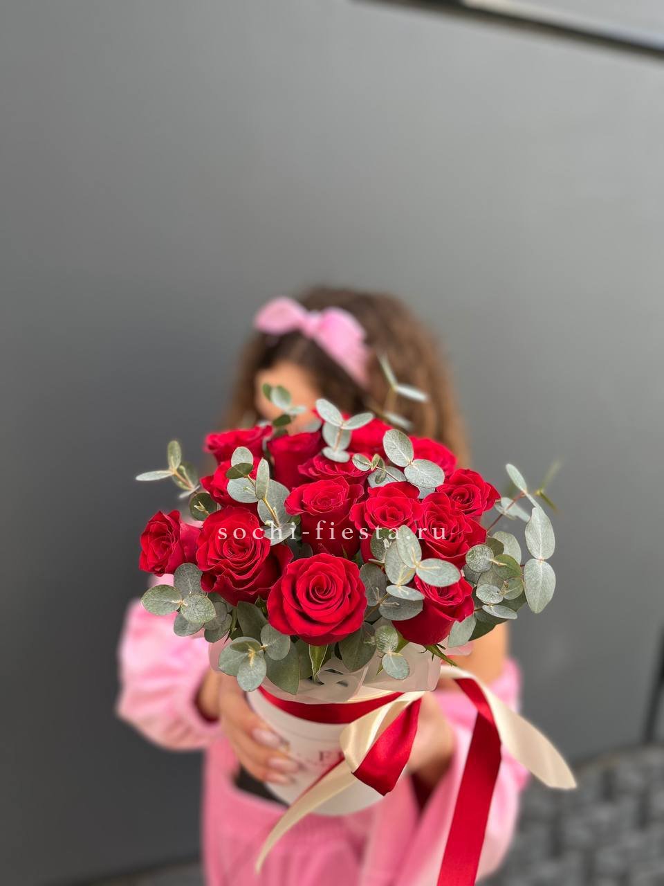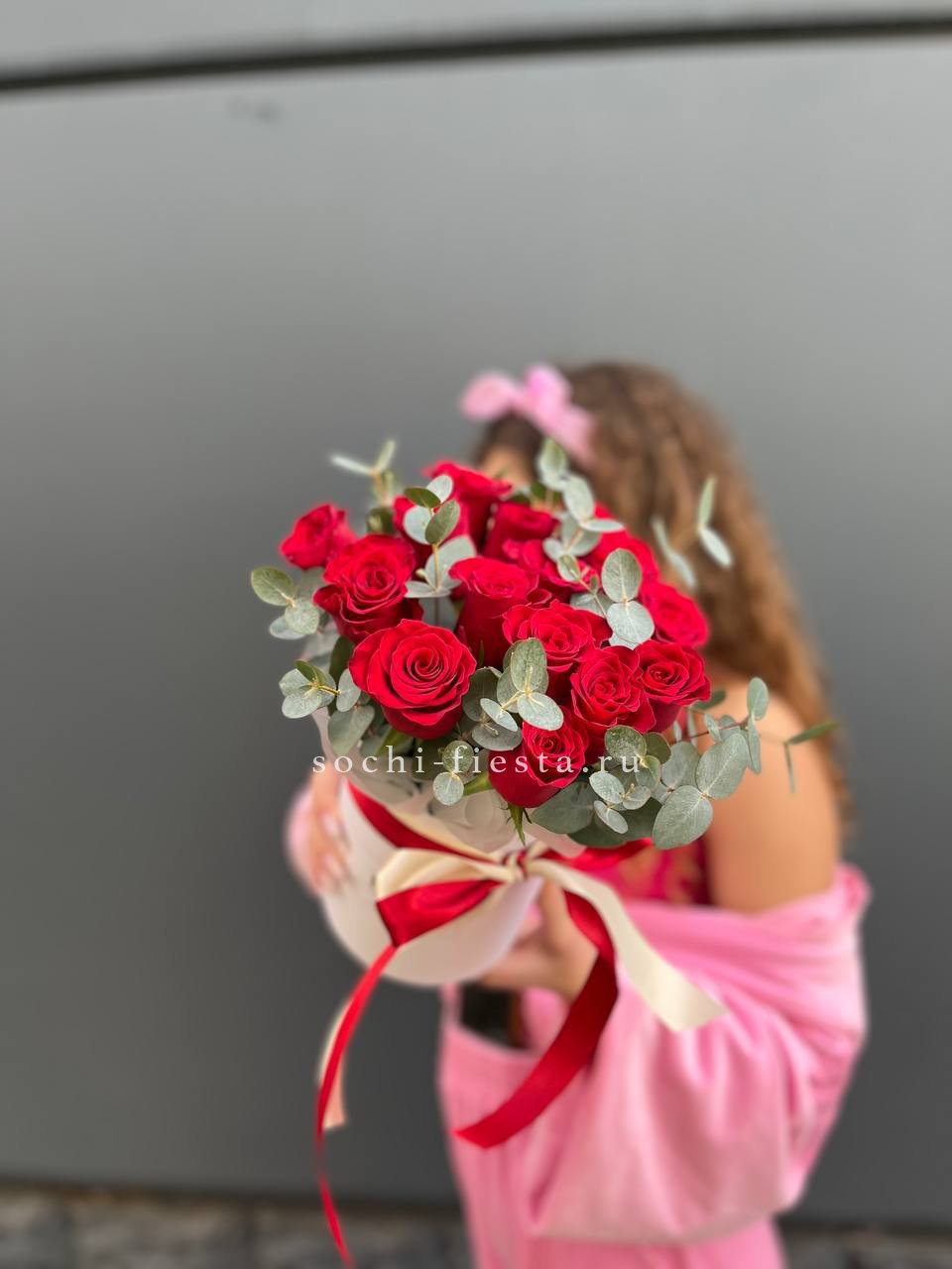 Красные розы и белые цимбидиумы собраны в круглом боксе с атласной лентой. Плотная укладка бутонов создаёт насыщенную композицию, где каждый цветок виден и различим. Классика флористики в удобном формате.