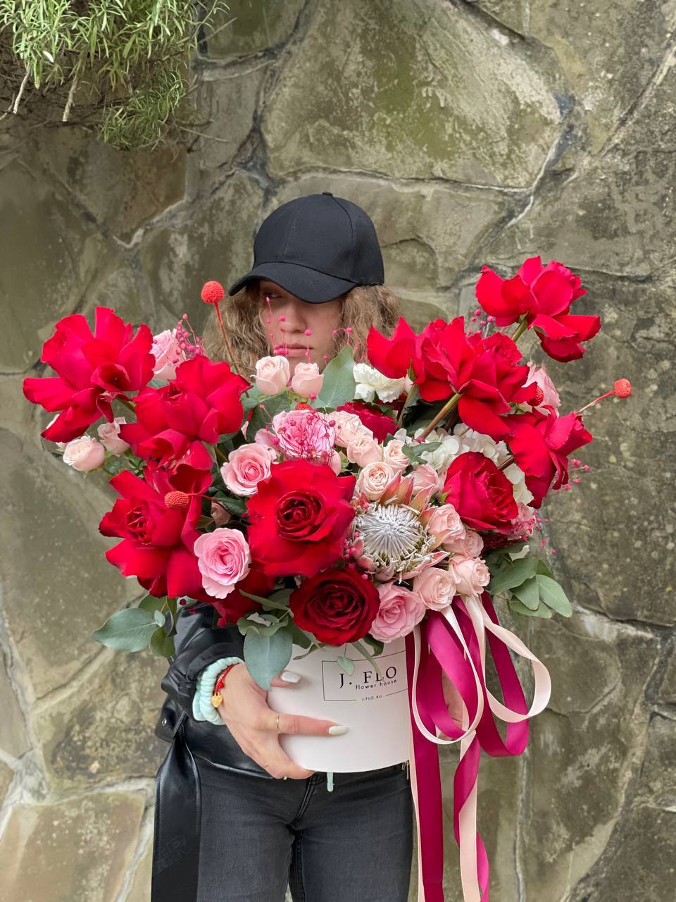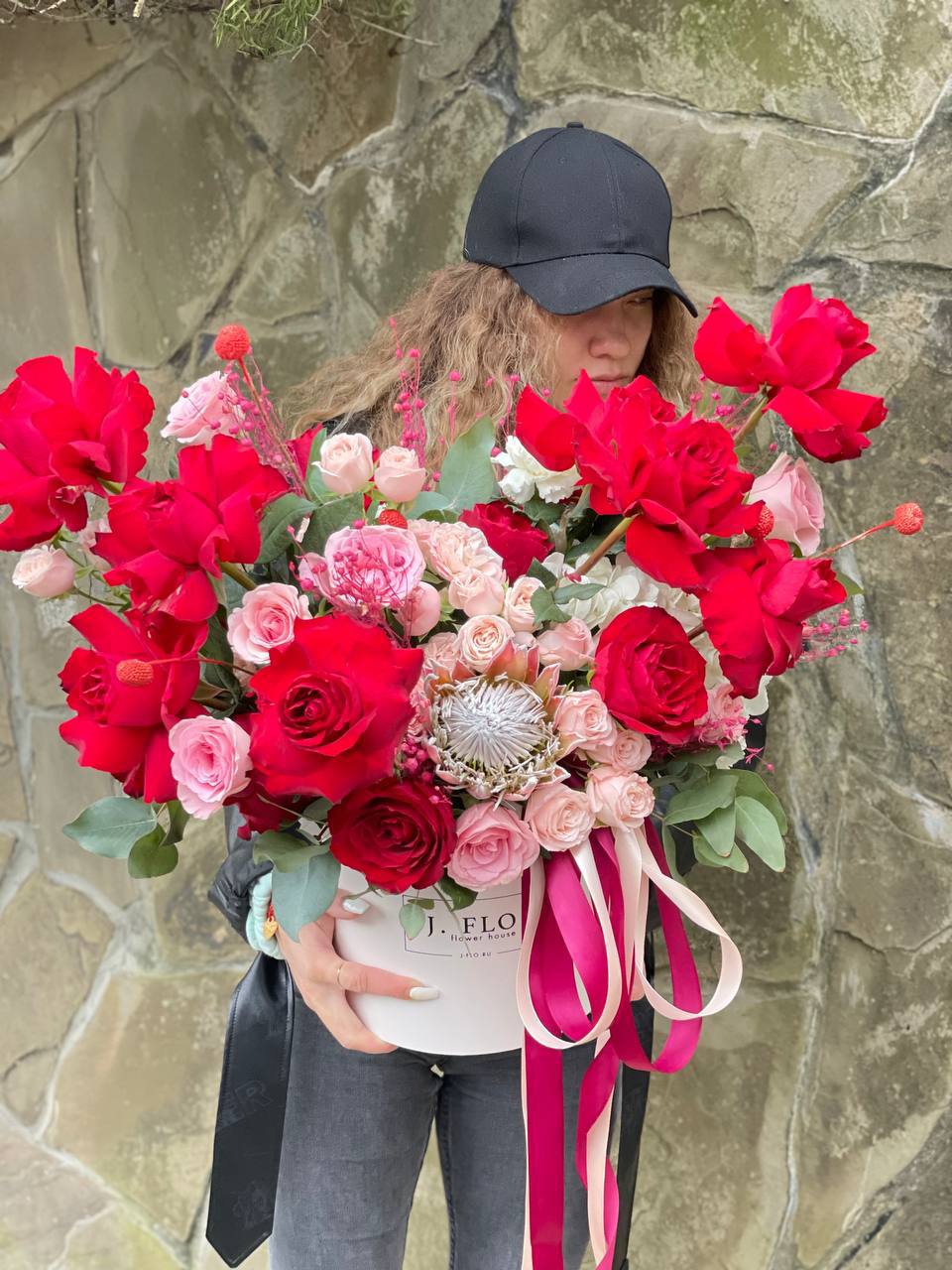 Композиция в боксе собрана на контрасте красных и розовых роз с экзотической протеей. Яркие бомбастики и воздушная гортензия создают объёмную текстуру, а сухоцветы добавляют графичности. Готовое решение для яркого поздравления.