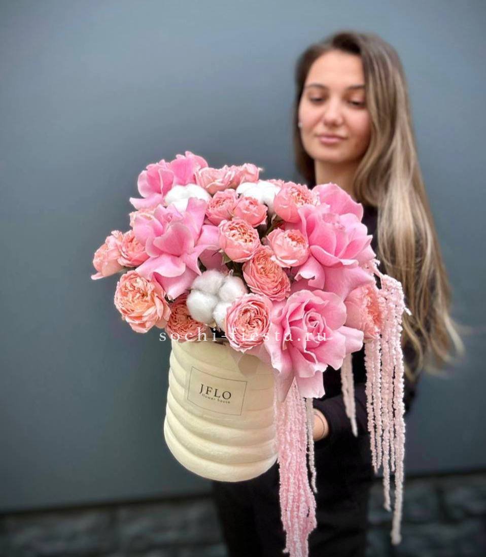 Розовая палитра переходит от французских роз к кустовым Джульетта с добавлением хлопка. Композиция в цилиндре сочетает воздушность и плотность фактур.