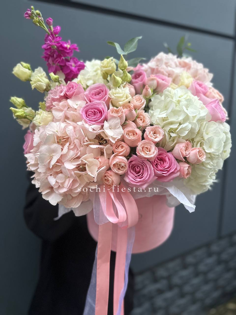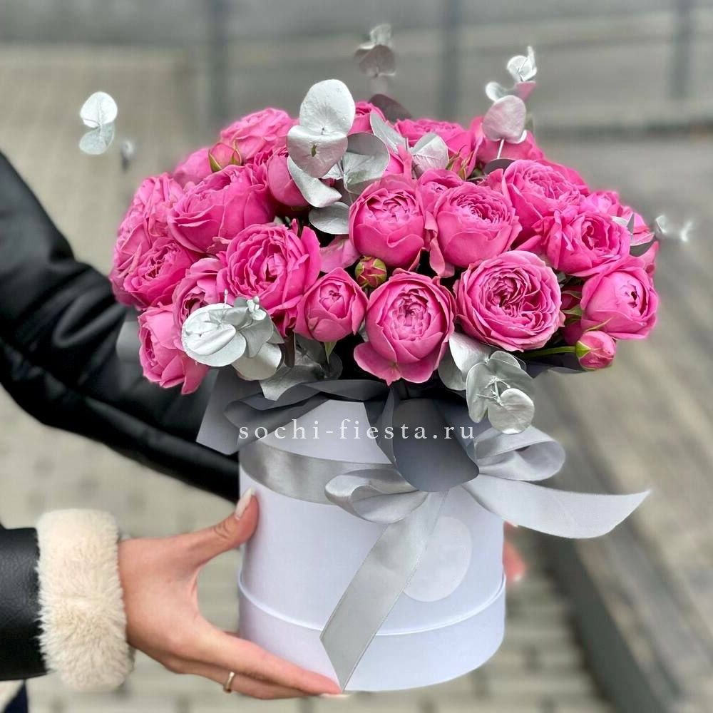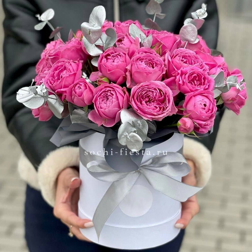 Хризантемы и кустовые розы раскрываются слоями, создавая воздушную текстуру. Эустома добавляет глубину, а эвкалипт формирует естественный контур. Композиция в боксе держит форму и долго сохраняет свежесть.