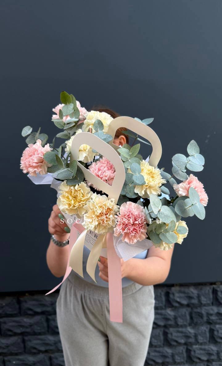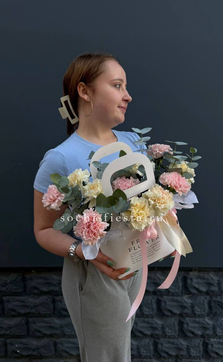 Розовые розы встречаются с орхидеей цимбидиум в объемной сумке-кашпо. Эустома и диантус создают многослойность, а кустовые розы заполняют пространство между крупными бутонами. Композиция держит форму и радует насыщенностью.