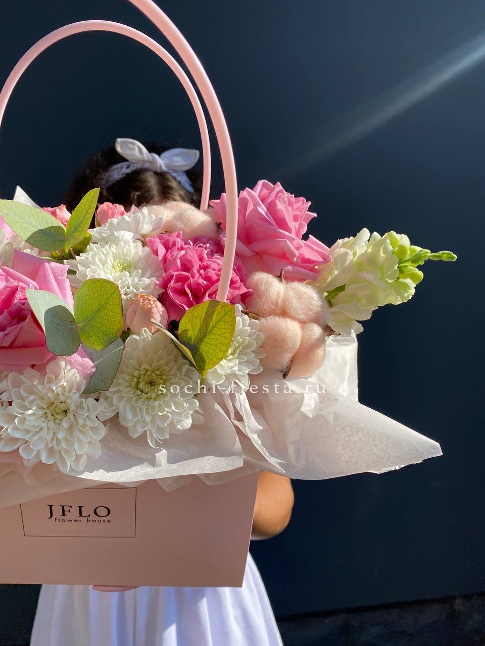 пионы, хризантемы,кустовые розы,лагурус, лента, сумка-кашпо.