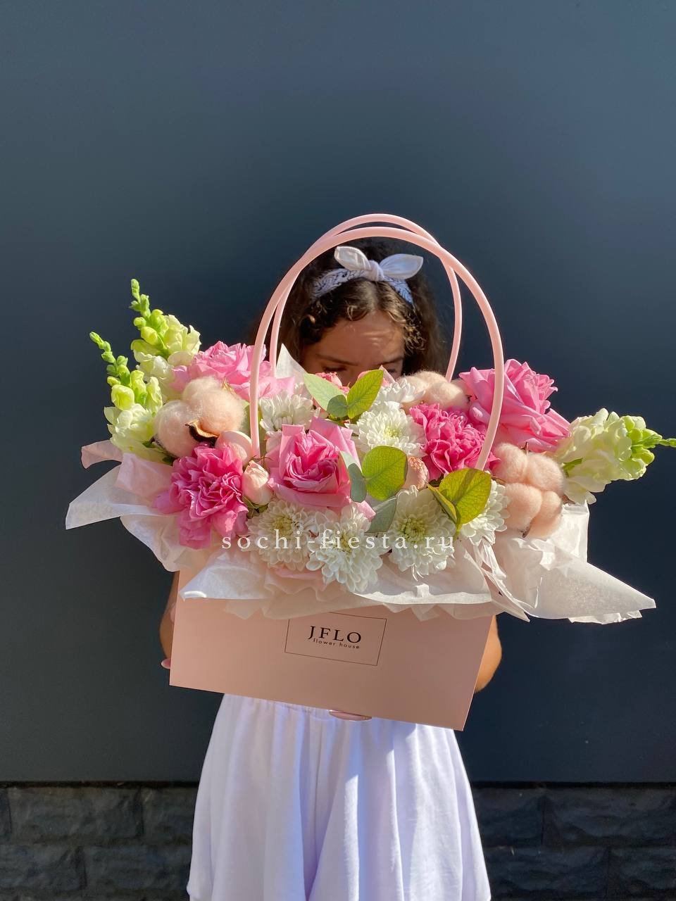 Пионы раскрываются среди кустовых роз и хризантем, а лагурус добавляет мягкие текстурные акценты. Сумка-кашпо с лентой удерживает форму и позволяет композиции сохранять объем. Сезонное сочетание с природной гармонией.