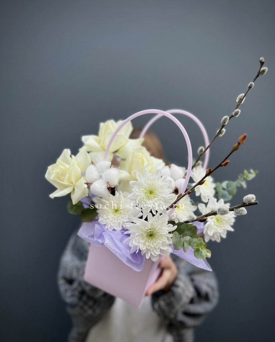 пионовидные кустовые розы, альстромерия, лента, сумка-кашпо.
