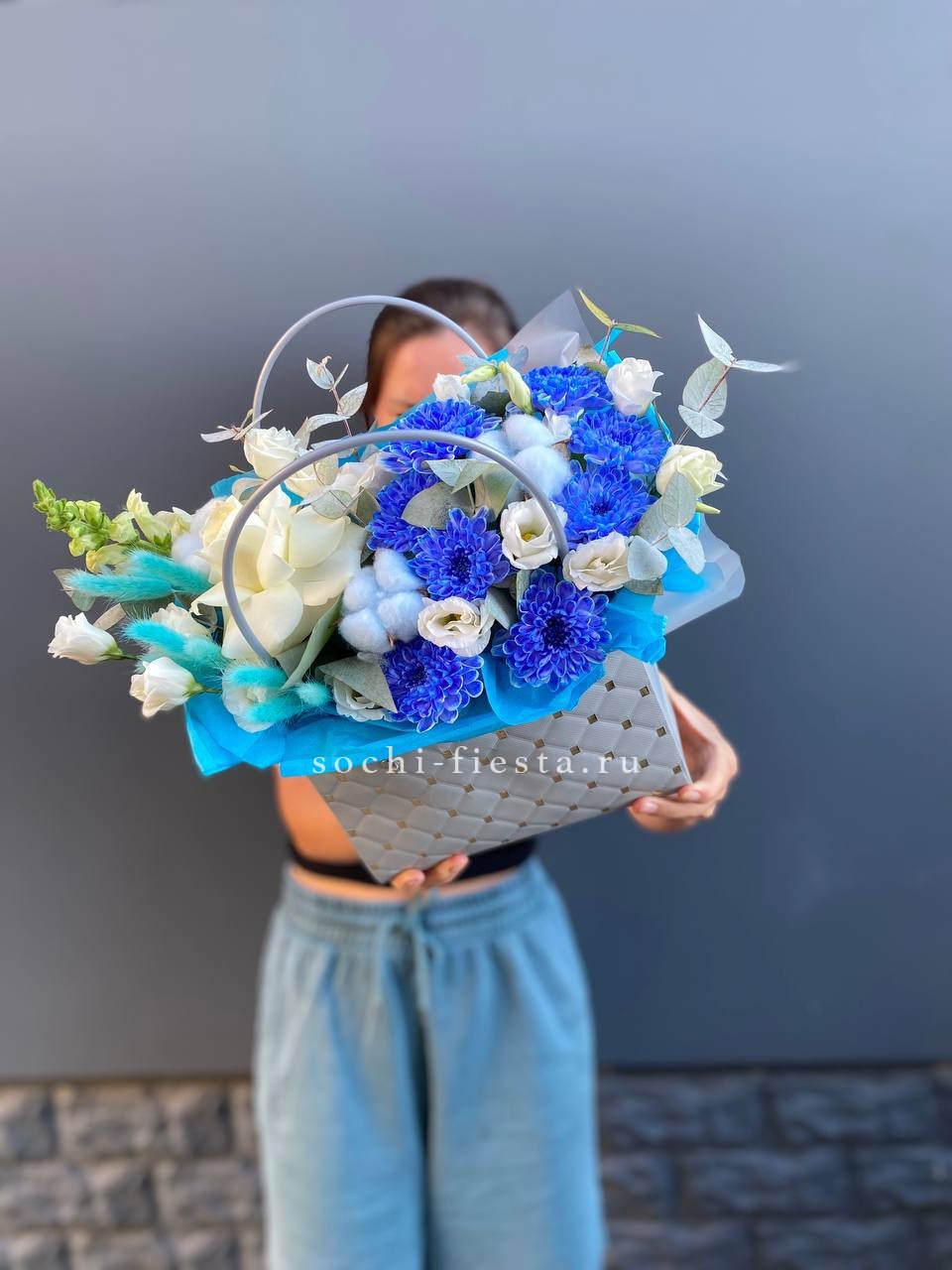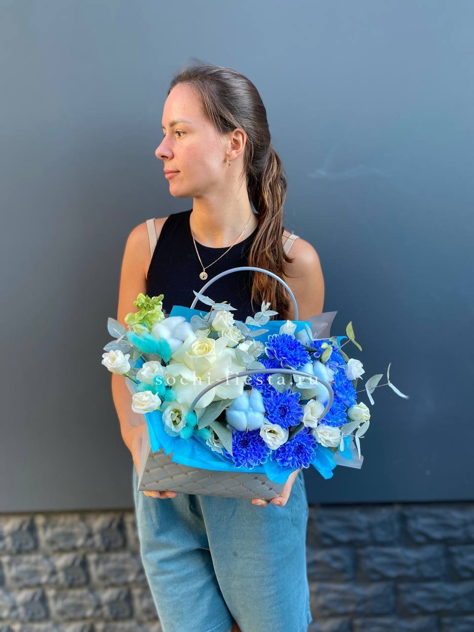 Композиция в сумочке собрана из розовых роз, гортензии и маттиолы с добавлением декоративных бигуди. Мягкая палитра и необычные детали создают легкое романтичное впечатление.