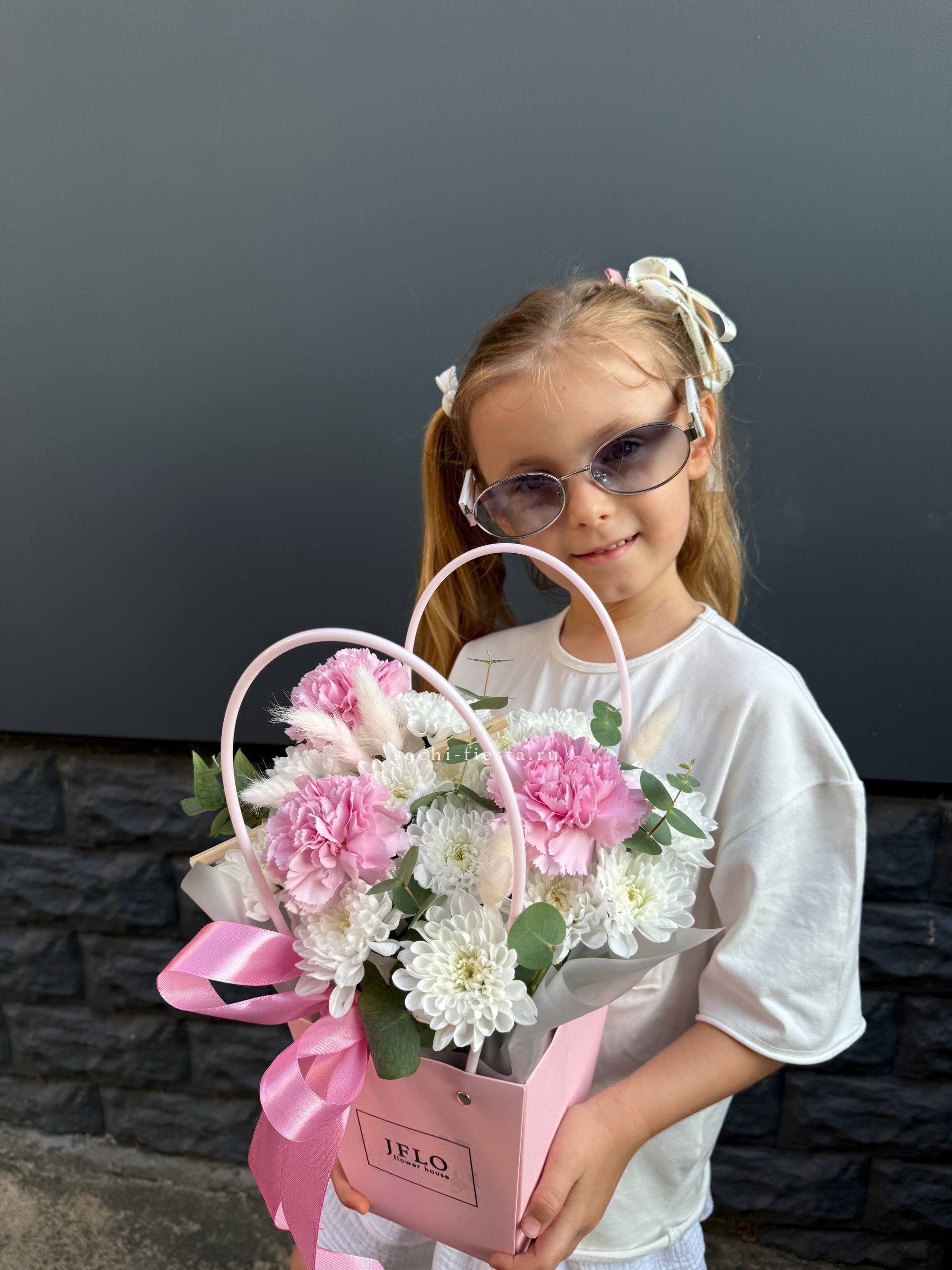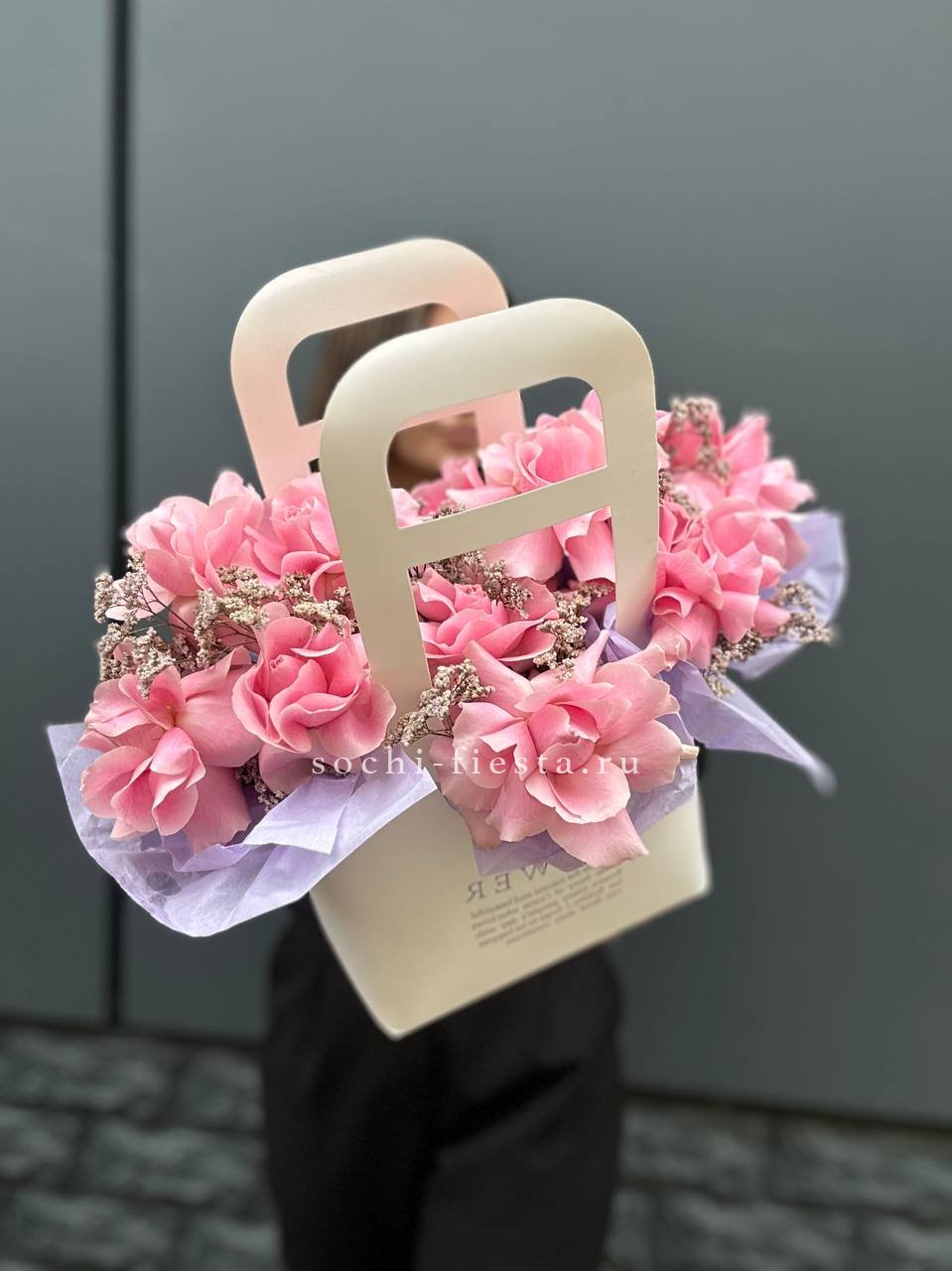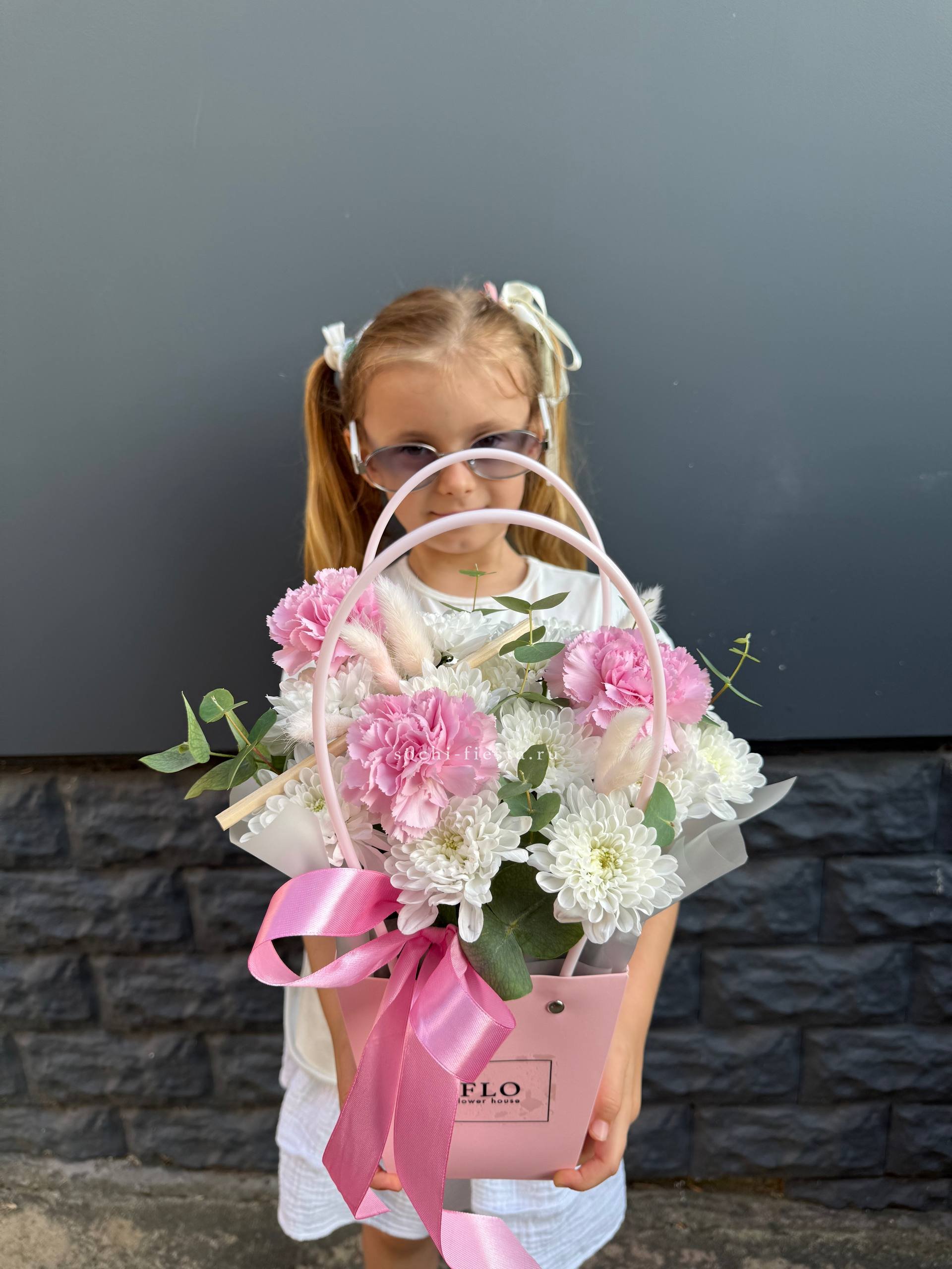 Яркая композиция в формате сумочки объединяет насыщенные герберы и белые розы. Бигуди добавляют графичности, эвкалипт завершает форму мягкими линиями.