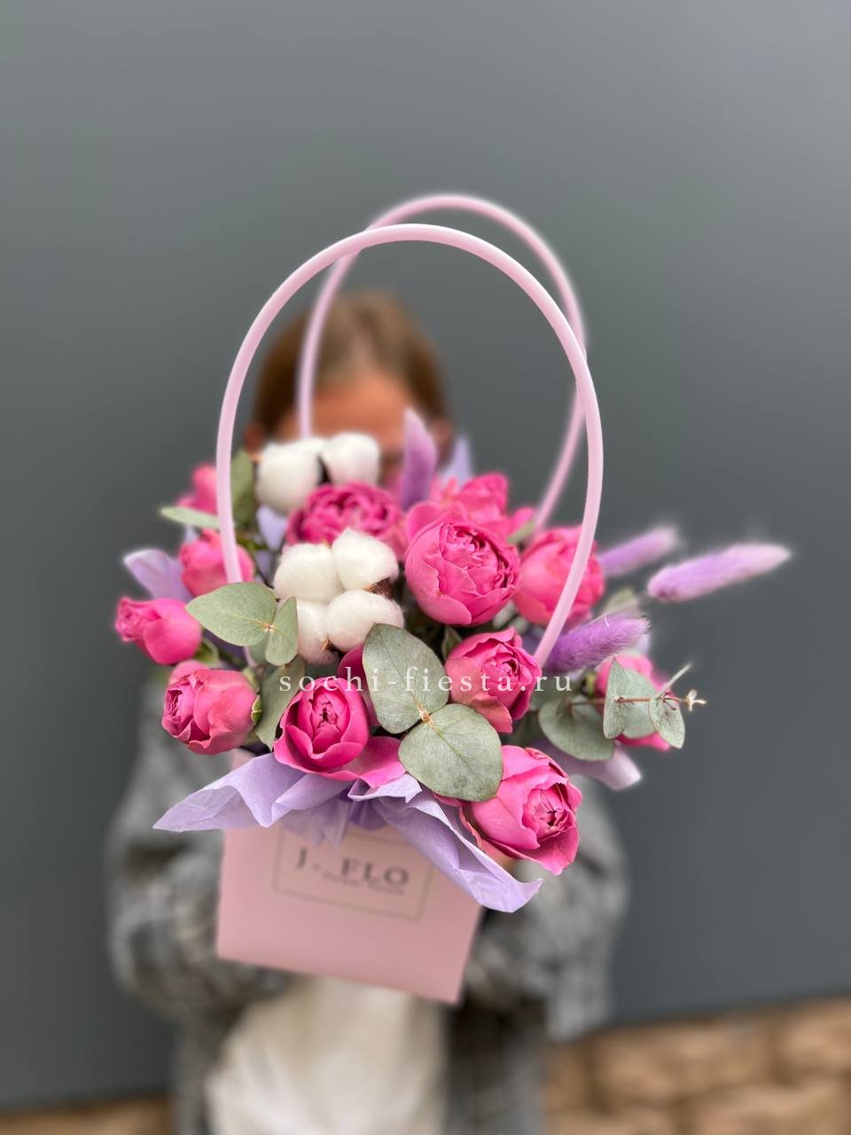 Пионовидные розы раскрываются пышными шапками рядом с воздушными соцветиями эустомы. Компактная форма сумочки удобна для вручения и не требует поиска вазы.