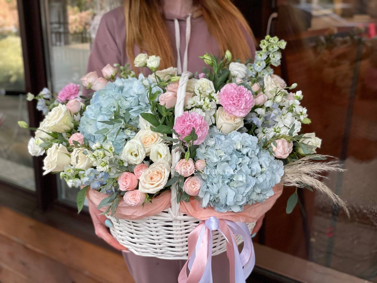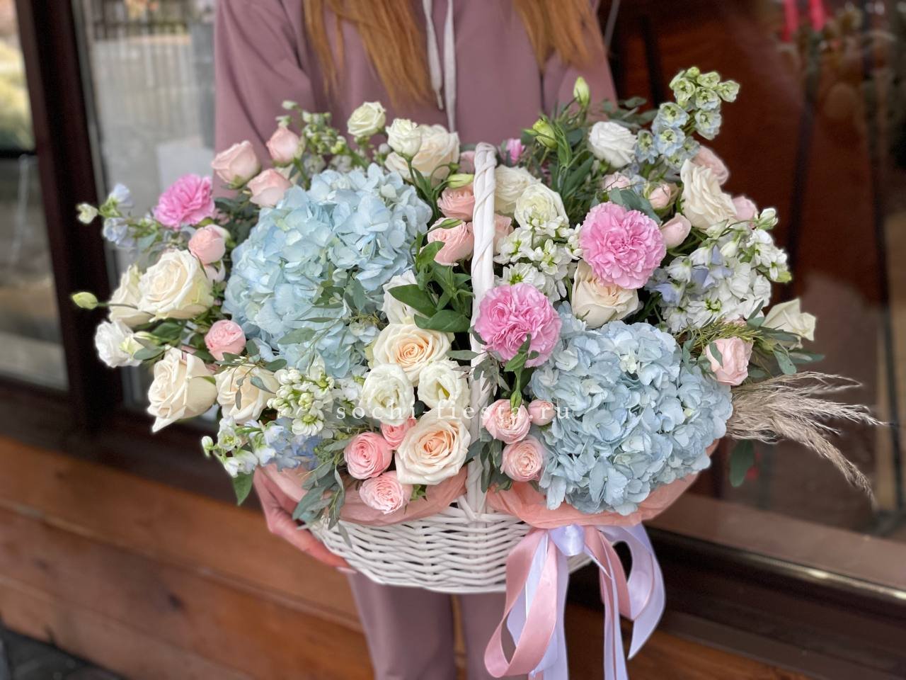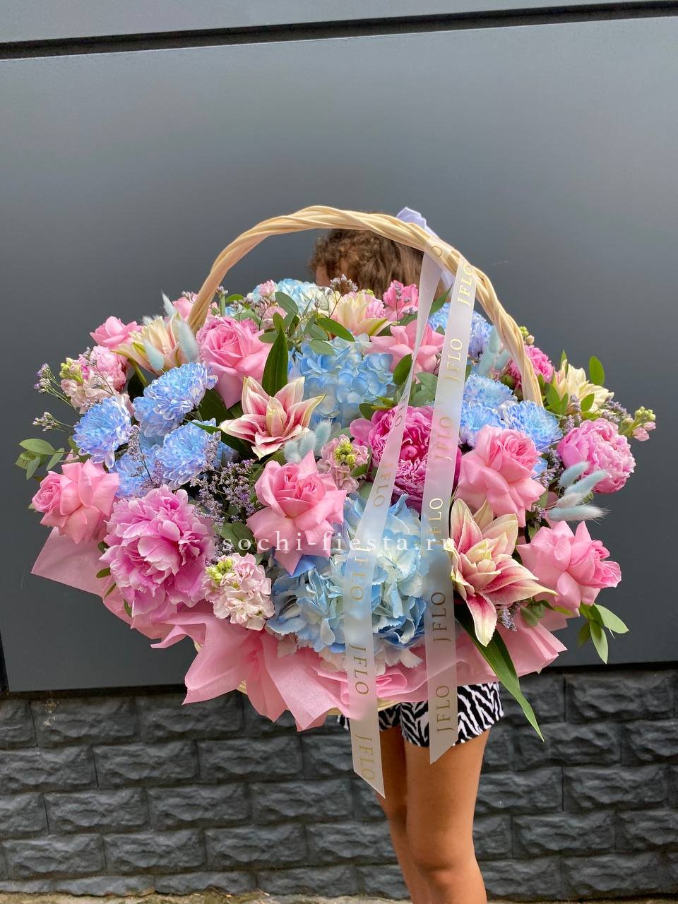 гортензии, лилии, хризантемы, пионы, лимониум, маттиола, корзина.